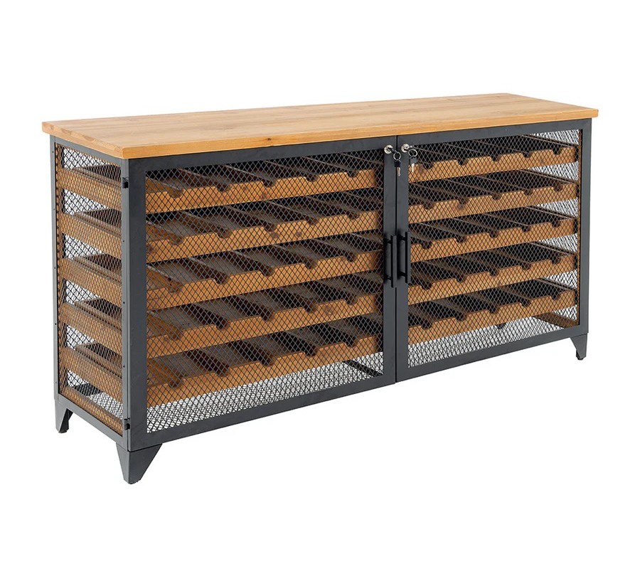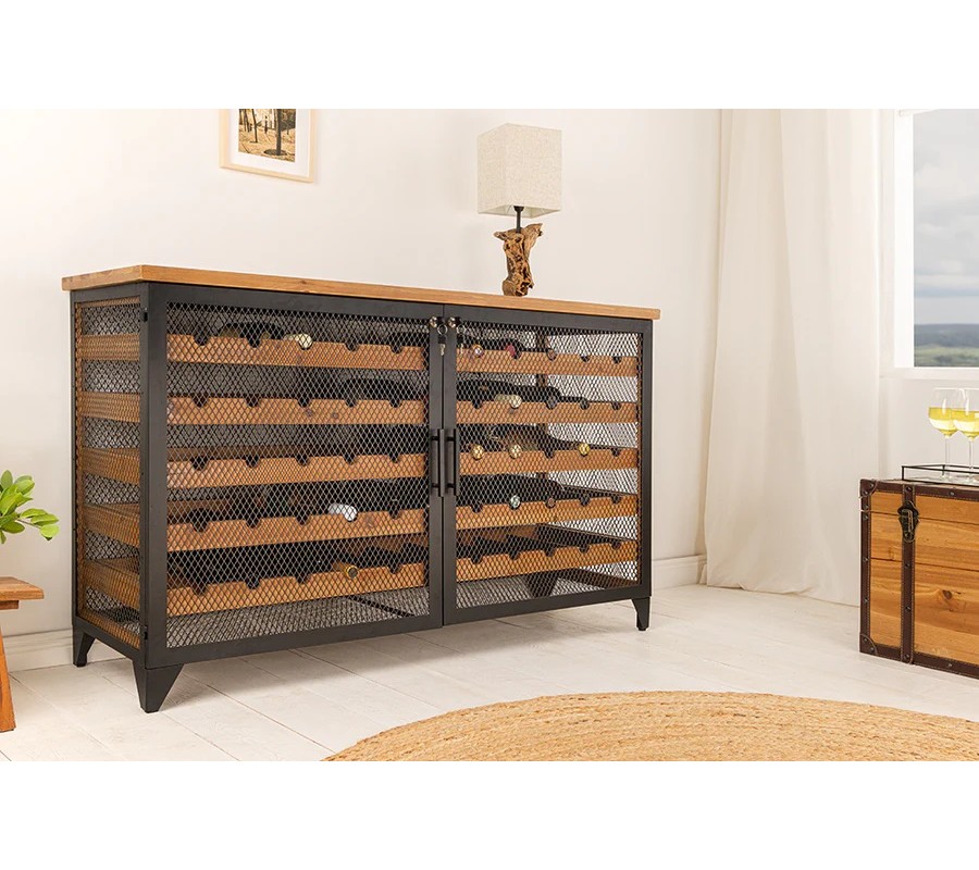 Moderná industriálna vinotéka Crawley je výrazným spojením masívneho jedľového dreva a čiernej kovovej konštrukcie, ktoré spolu vytvárajú autentický loftový charakter. Robustný industriálny vzhľad kovu je zjemnený svetlo hnedým odtieňom výsuvných drevených zásuviek, vďaka čomu vinotéka pôsobí vyvážene, nadčasovo a štýlovo.
