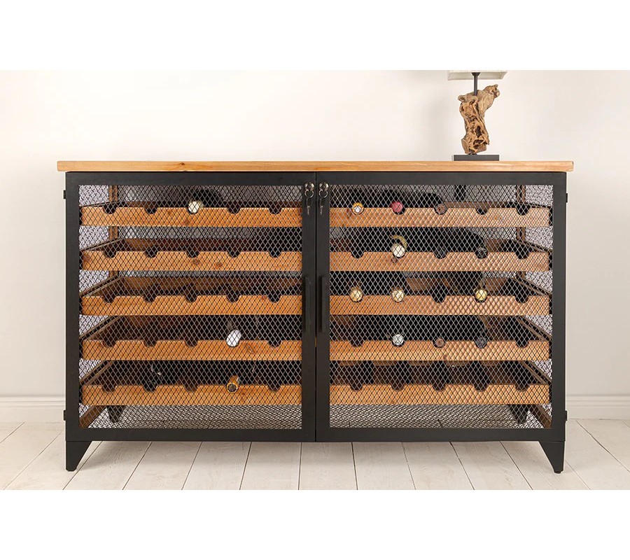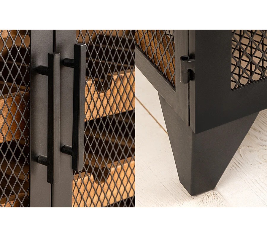 Celá konštrukcia je vyhotovená z čierneho pevného kovu s povrchovou úpravou a je doplnená o kovový výplet z mriežky, ktorý tvorí bočné steny aj dvierka vinotéky. Tento výplet nielen podčiarkuje industriálnu estetiku nábytku, ale zároveň umožňuje vizuálny kontakt s uloženými fľašami aj pri zatvorených dvierkach, čím pôsobí vzdušne a odľahčene napriek svojej masívnosti.