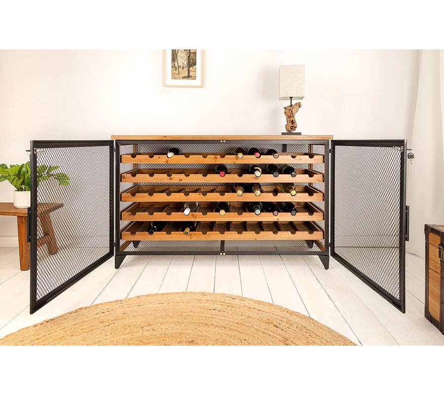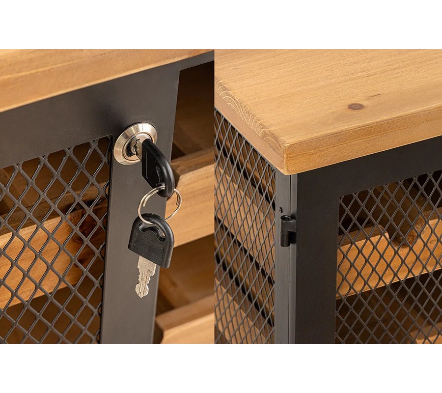 Praktickým a zároveň bezpečnostným prvkom je uzamykanie dvierok pomocou kovového zámku s dvomi kľúčikmi, pričom jednotlivé časti vinotéky je možné uzamykať samostatne. Tento detail chráni vašu zbierku vín a zároveň prirodzene zapadá do industriálneho dizajnu vinotéky. Masívne kovové úchyty na dvierkach zvyšujú komfort pri manipulácii a dotvárajú technický charakter nábytku.