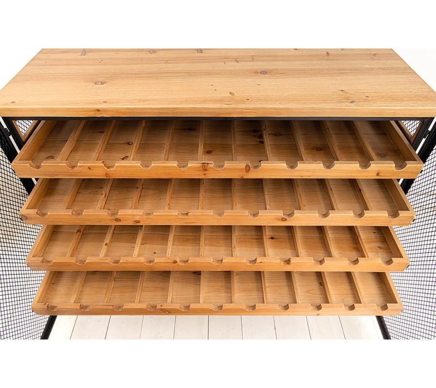 Dizajnová industriálna vinotéka Crawley s výsuvnými zásuvkami z jedľového dreva a s čiernou kovovou konštrukciou 127 cm
