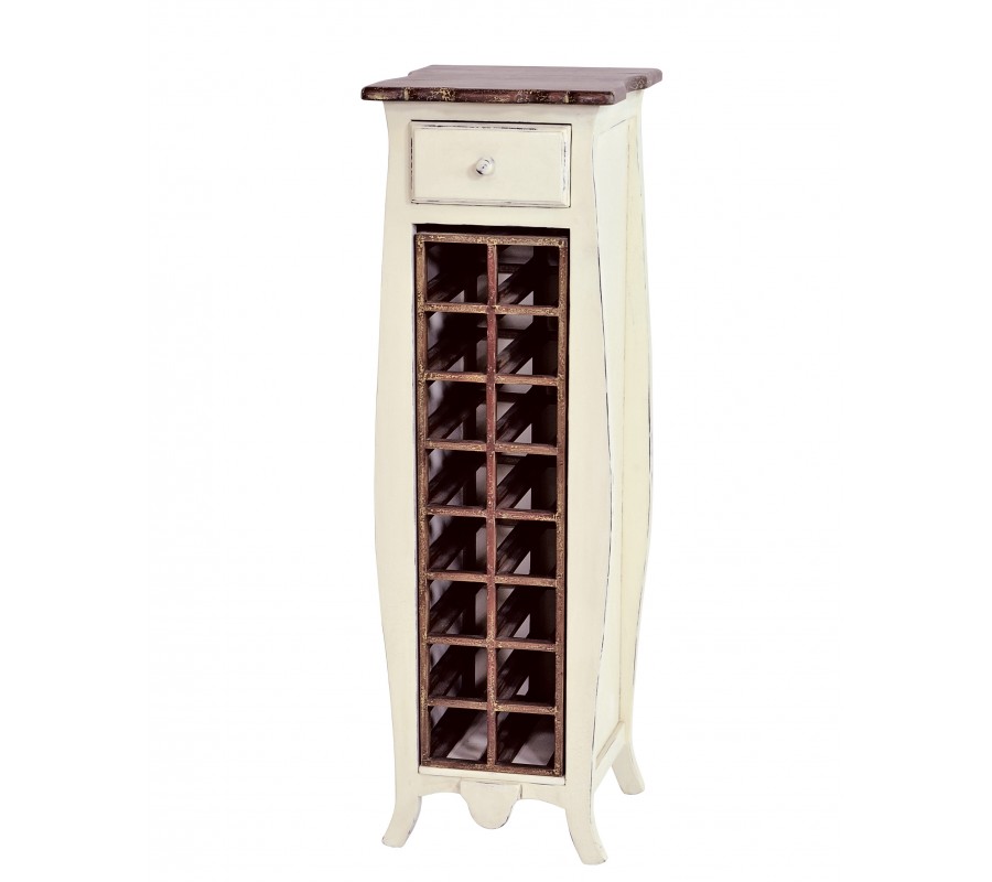 Vaša zbierka vín či likérov si rozhodne zaslúži svoje vlastné miesto, kde vám bude po ruke a zároveň bude ladiť s vašim provensálskym starožitým zariadením obývačky, jedálne či krytej zimnej záhrady. Regál Antoinette s poličkami štvorcového tvaru s kapaciotu až 16 fliaš je vyrobený z kvalitného mahagónového dreva, a teda disponuje vysokou kvalitou a stabilitou prevedenia. Je ozvláštnený vrchnou doskou a výstelkou jednotlivých poličiek v tmavo hnedom vyhotovení, pričom vynikne unikátna štruktúra dreva. Silueta regálu Antoinette sa nesie v oblých a vretenovitých líniách. Nožičky sú zaujímavo vykrojené do vonkajšej strany a ich prepojenie je doplnené ozdobným štítom v prednej časti regálu. Pod vrchnou doskou je vsadená zásuvka s jednoduchým úchytom okrúhleho tvaru. Náter konštrukcie má starožitný nádych vďaka ošucháným častiam a nesie sa v duchu príjemnej vanilkovej tlmenej farby.