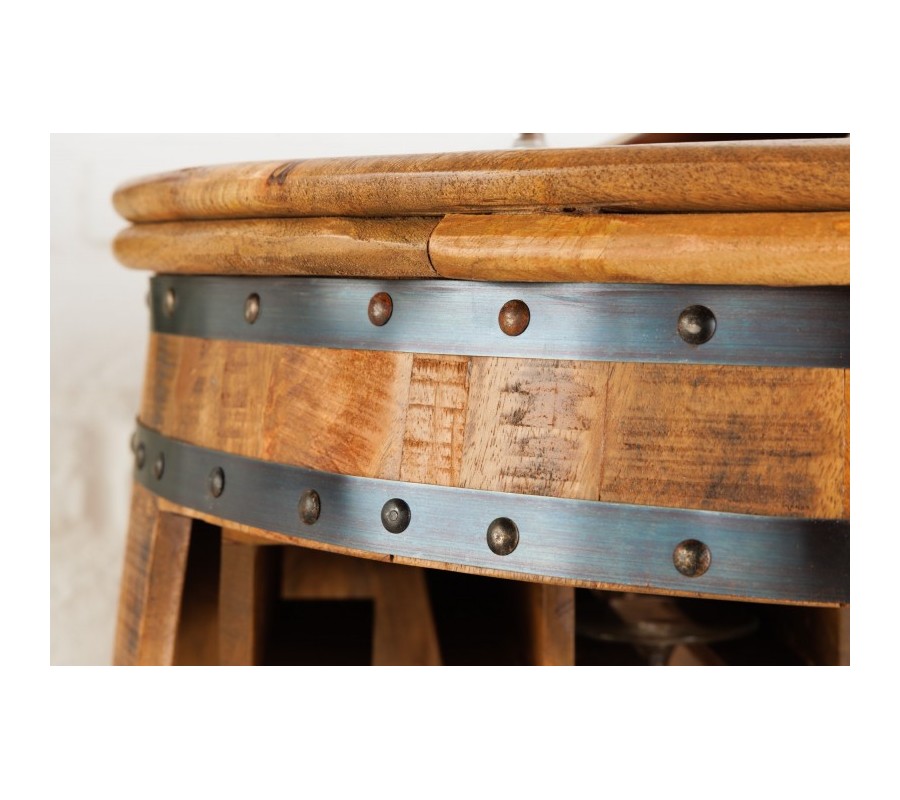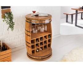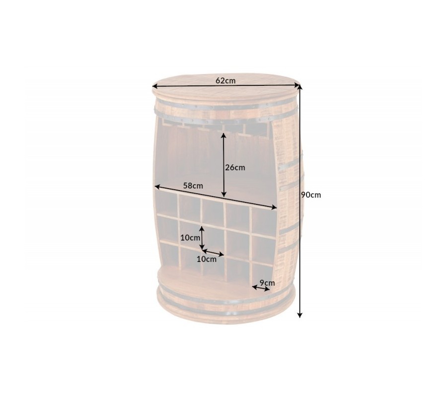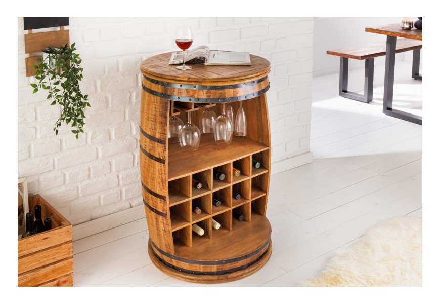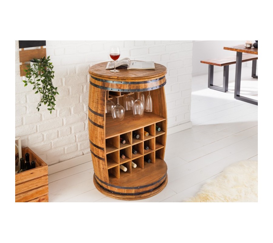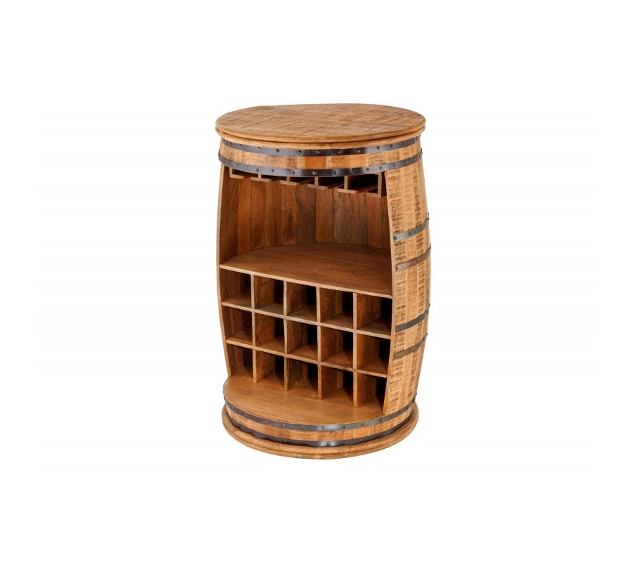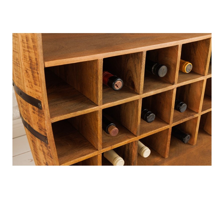 Štýlová vinotéka z našej kolekcie Crawley predstavuje praktický a dizajnový doplnok do interiéru pre každého milovníka kvalitného vína. Zaujíme svojím okrúhlym tvarom v podobe suda s výrezom na prednej strane, kde sa nachádza úložný priestor. Povrchová úprava v prírodnej hnedej farbe necháva vyniknúť prirodzenú kresbu mangového masívneho dreva, vďaka čomu vinotéka získava štýlový prírodný nádych. Vhodne zapadne aj do koloniálne ladených priestorov v kombinácii s koženou sedačkou a ďalším nábytkom z masívneho dreva. Vinotéka Crawley disponuje pätnástimi otvormi na fľaše, priestorom na zavesenie pohárov (možno zavesiť 6) a okrúhlou povrchovou doskou. Je tak praktickým kúskom, ktorý môže zároveň poslúžiť aj ako príručný či odkladací stolík, či ako stolík na servírovanie vašich obľúbených nápojov. Koloniálny vzhľad dopĺňajú štýlové kovové prvky čiernej farby s vybíjaním, ktoré navzadzujú dojem vínneho suda. Pre umocnenie naturálneho nádychu odporúčame vinotéku Crawley kombinovať s doplnkami z prírodných materiálov a izbovými rastlinami.