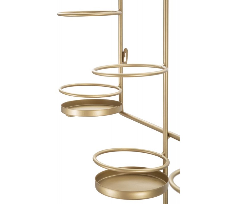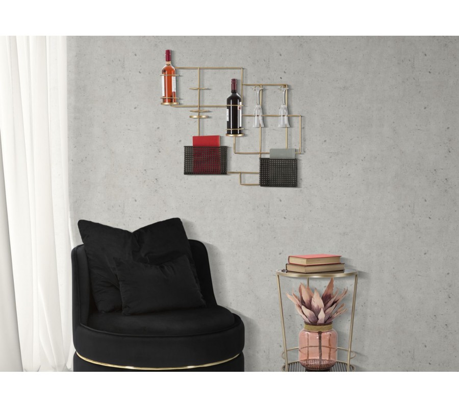 Stojan má tri držiaky na vínové fľaše a dva držiaky na poháre, ktoré umožňujú bezpečné a štýlové uskladnenie vína a skla. Jeho geometrické línie a jemné kovové prvky odrážajú art deco eleganciu, zatiaľ čo kontrast medzi zlatou konštrukciou a čiernymi prvkami dodáva moderný charakter.