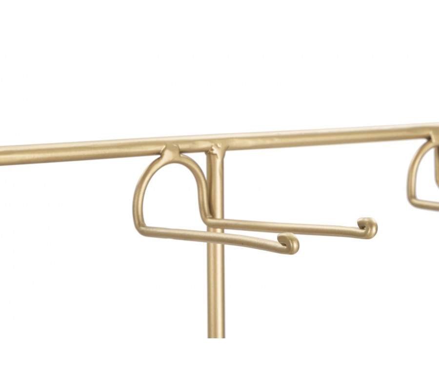 Art deco závesná kovová vinotéka Lenan s tromi držiakmi na fľaše a dvomi držiakmi na poháre v zlatej a čiernej farbe 77 cm