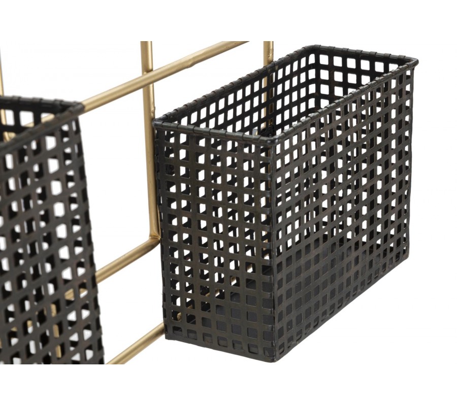 Elegantný závesný stojan na víno Lenan v glamour a art deco štýle kombinuje luxusný dizajn s praktickým využitím. Jeho kovová konštrukcia v lesklej zlatej farbe dodáva priestoru sofistikovaný vzhľad, zatiaľ čo dva čierne kovové košíky poskytujú úložný priestor na drobnosti alebo barové doplnky.