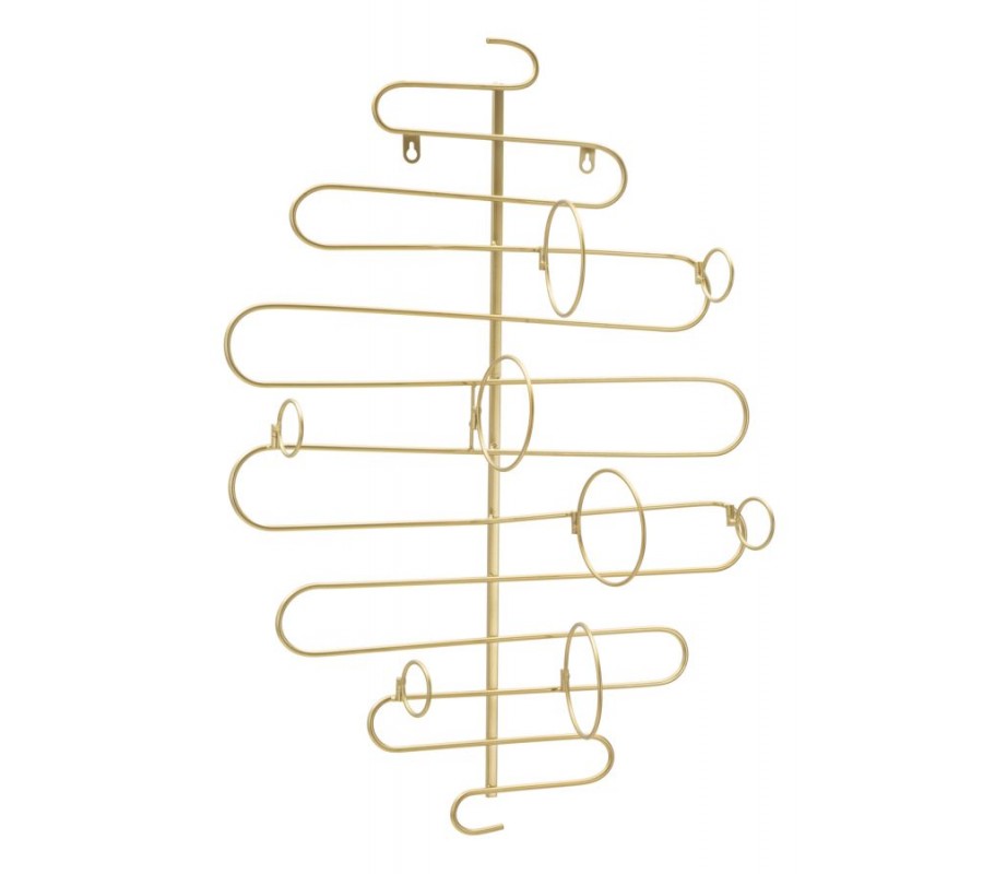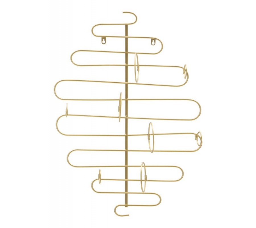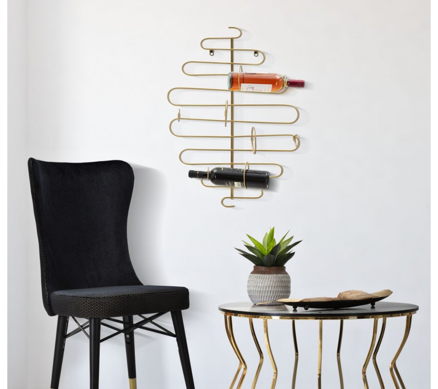 Závesný držiak na víno Malos v art deco a glamour štýle upúta svojím elegantným a dekoratívnym dizajnom. Jeho zlatá kovová konštrukcia má originálny vlnitý tvar, ktorý pripomína umelecký prvok a zároveň ponúka praktické uskladnenie vínových fliaš.