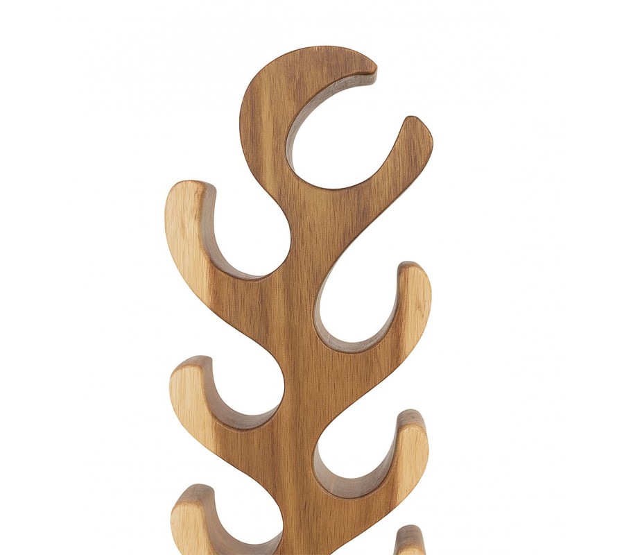 Stojan má elegantný organický tvar inšpirovaný prírodou. Svojou siluetou pripomína morské koraly. Má mohutnú obdĺžnikovú základňu, z ktorej vyrastá do výšky zvlnená centrálna línia. Na jej stranách vybiehajú ladné zakrivené držiaky na fľaše, organizované šachovnicovo. Dizajn je vyvážený, no mierna asymetria a zaoblené línie mu dodávajú vysoko dekoratívny, až florálny vizuál.