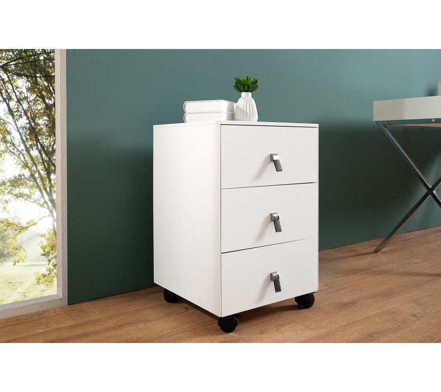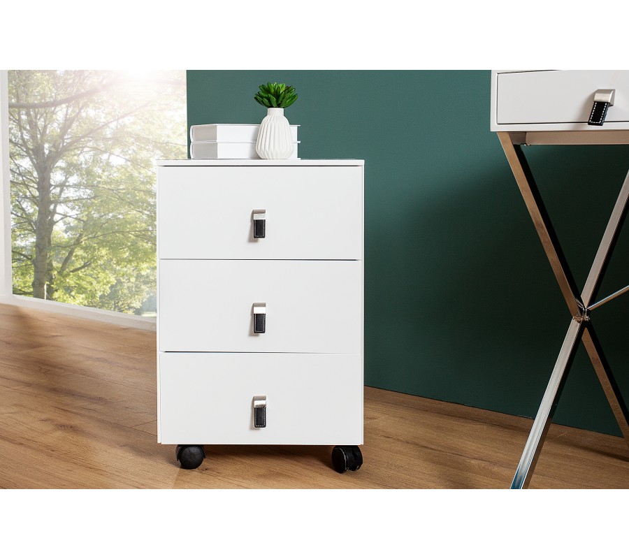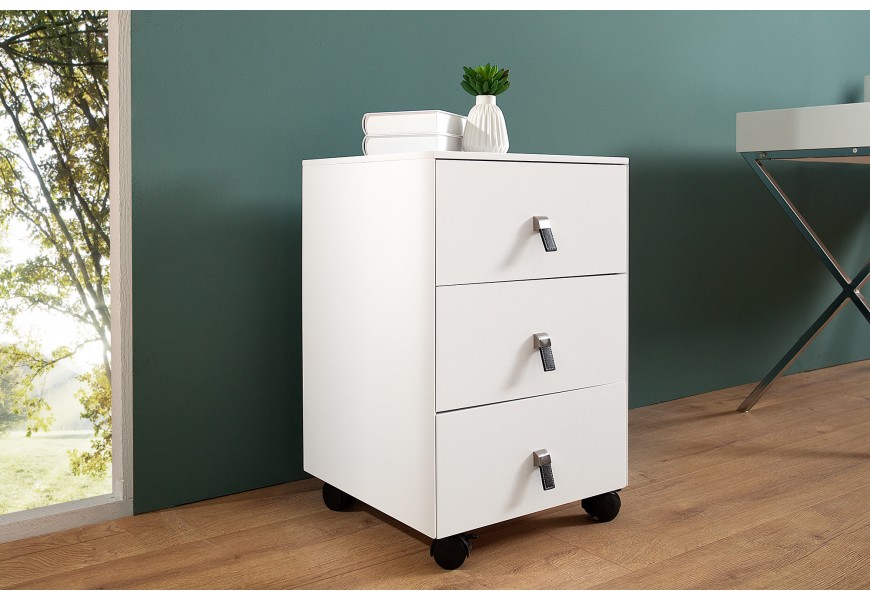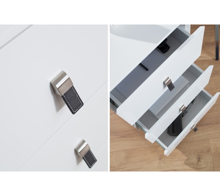 Štýlový zásuvkový box na odkladanie vecí, ktorý je doplnení o zaujímavý prvok v podobe kožených úchytiek.