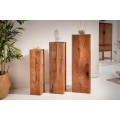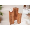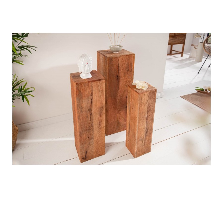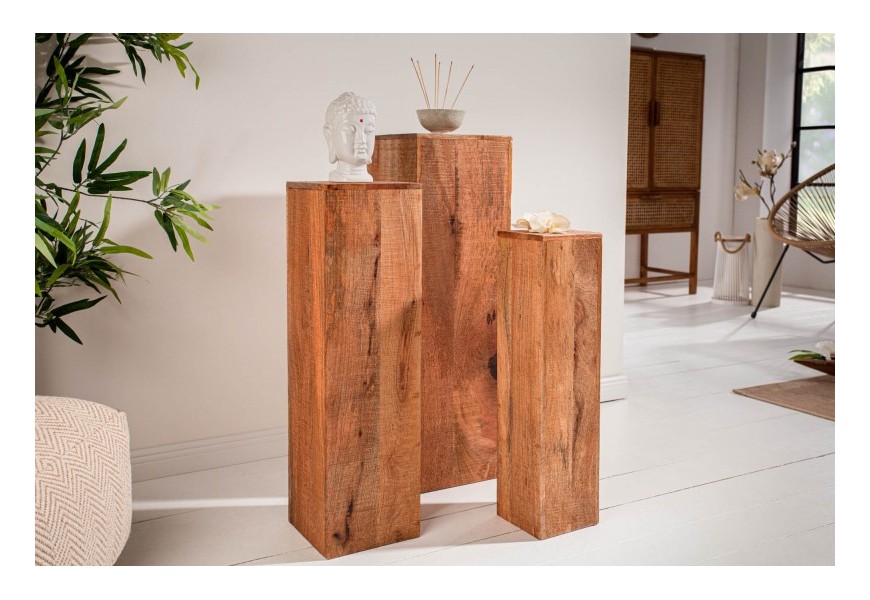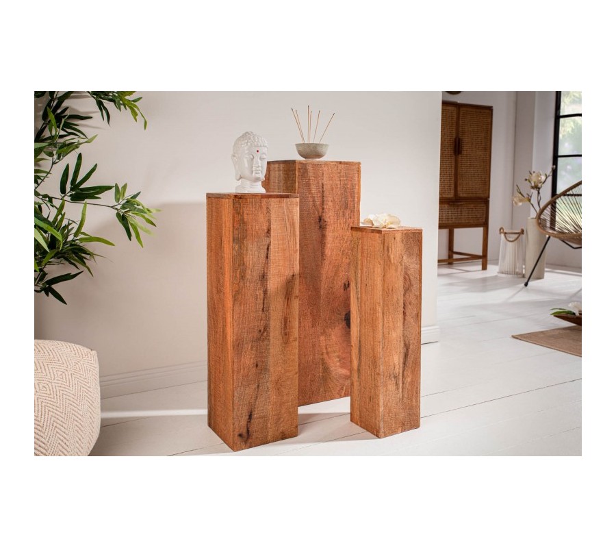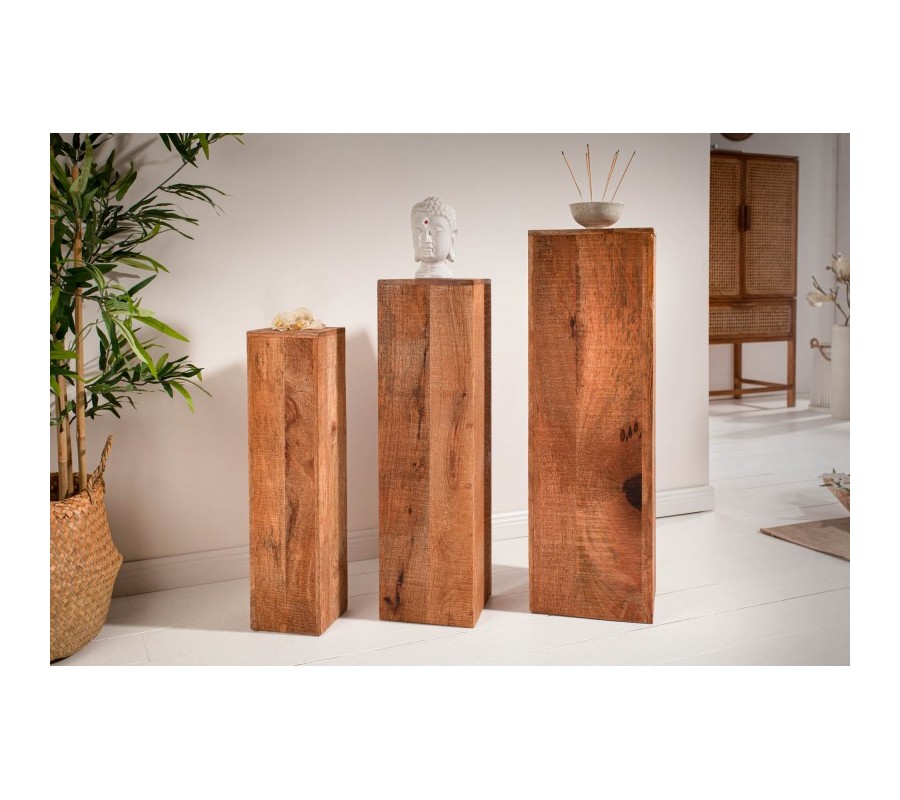 Štýlový set troch masívnych podstavcov z mangového dreva sa stane dokonalým doplnením vašich vidiecky, koloniálne či industriálne ladených domácností. Jednotlivé podstavce sú v rozdielnych rozmeroch. Najvyšší z nich má 80 cm a štvorcovú podstavu s rozmerom 25cm. stredný podstavec je vysoký 70cm so štvorcovou podstavou 20cm a najmenší podstavec má výšku 60cm s rozmerom štvorcovej podstavy 15cm. Podstavce sú vyrobené z mangového dreva a vďaka svojej dutej vnútornej časti sú značne odľahčené. Podstavce môžete použiť ako odkladací priestor na kvety, obľúbené suveníry či dekorácie. Podstavce Makassar krásne vyniknú ak ich umiestnite spolu ako sériu, no nestratia sa ani rozdelené po rozličných miestnostiach vo vašom interiéri.