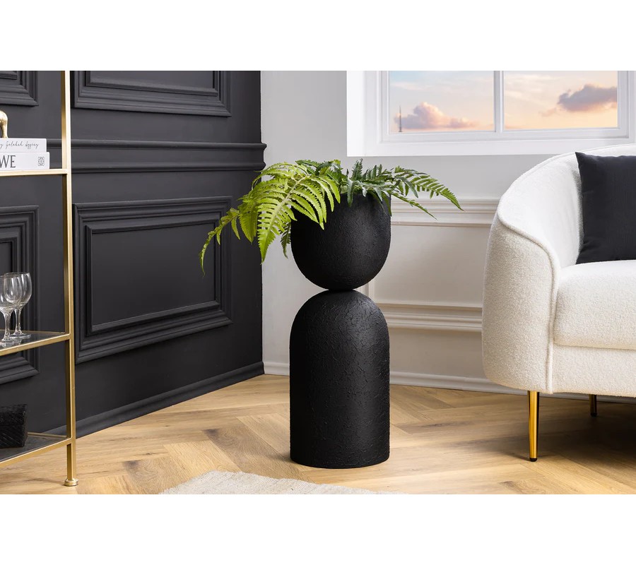 Kvetináč Sola v okrúhlom tvare s valcovou podstavou je dizajnový doplnok vyrobený z kovu v čiernej farbe s matným povrchom. Jeho jemná štruktúra pripomína ručné lisovanie, pričom na dotyk pôsobí, akoby bol obtláčaný špeciálnym nástrojom. Obojstranný dizajn umožňuje jeho otočenie, kvet môže byť umiestnený buď v menšej hornej časti, alebo vo väčšej valcovej časti. Ručné spracovanie mu dodáva unikátny vzhľad, ktorý podčiarkuje jeho moderný a sofistikovaný charakter.