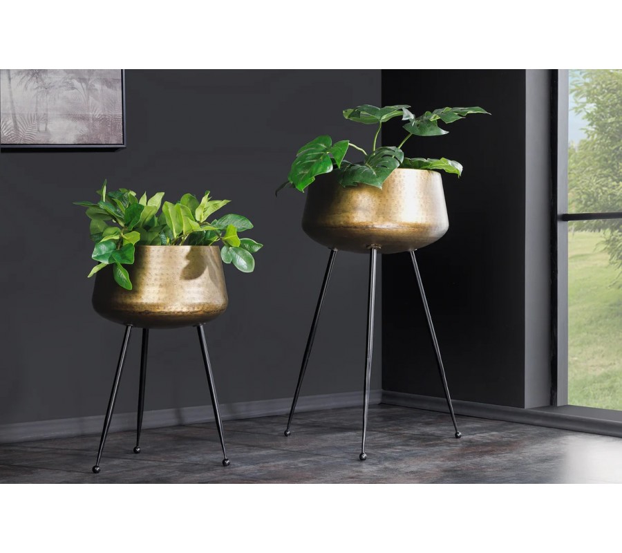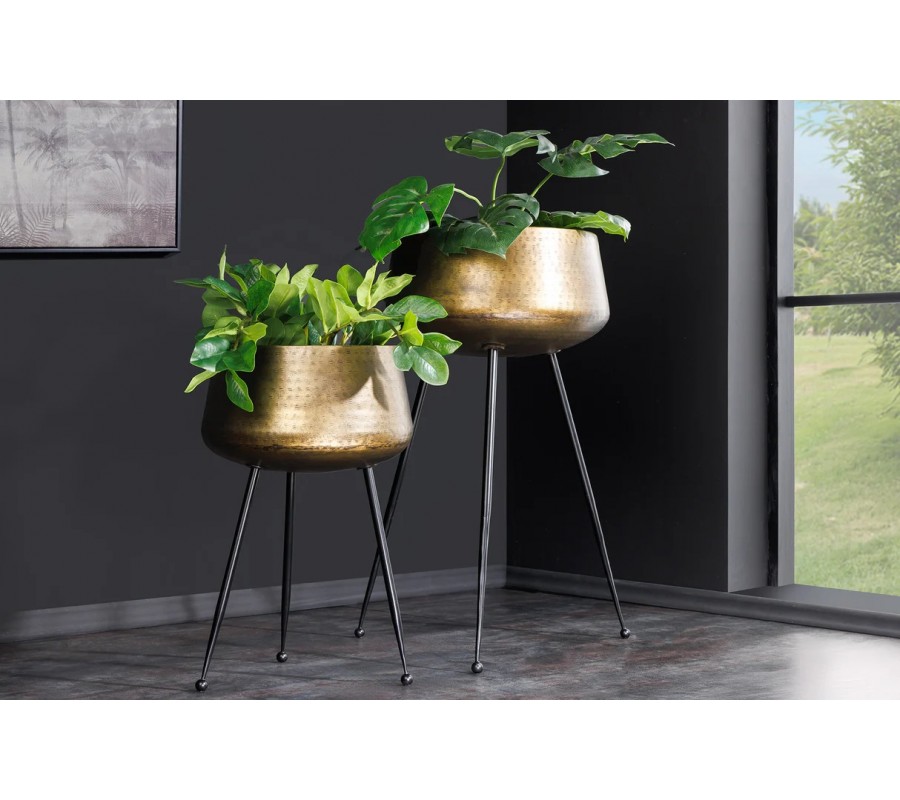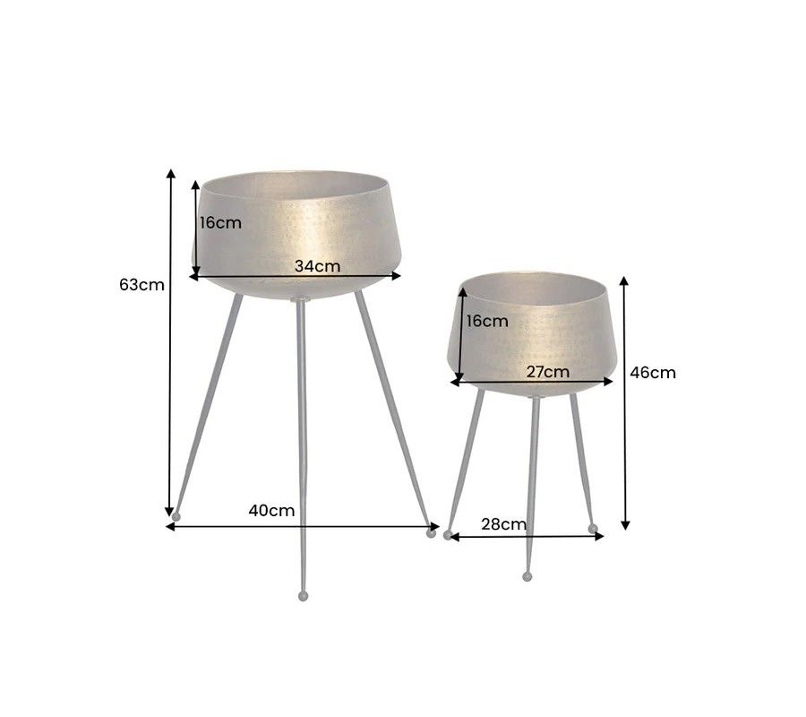 Výška kvetináčov je 63 cm a 46 cm, pričom priemery jednotlivých nádob sú 40 cm a 28 cm. Každý kus stojí na štíhlych čiernych nožičkách, ktoré sú mierne vyosené smerom von a zakončené guľovitými detailmi. Tento prvok im dodáva retro nádych v duchu art deco a zároveň zaisťuje stabilitu aj pri väčších rastlinách.
