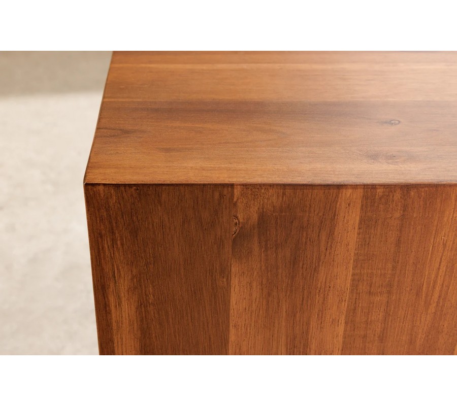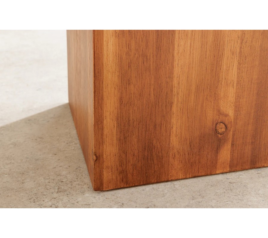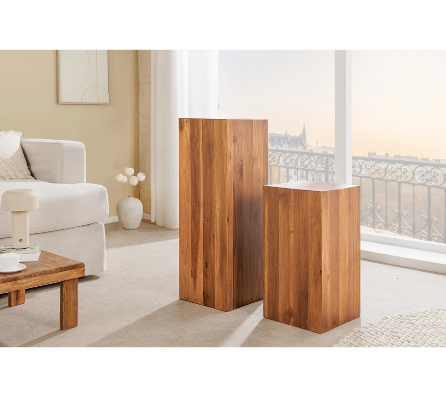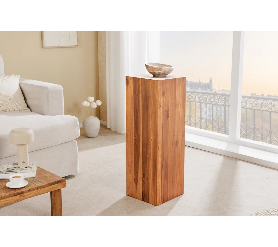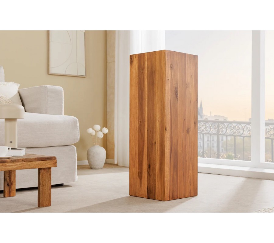 Masívny vidiecky podstavec Horaz vytvára pevný, elegantný a mimoriadne prirodzený akcent v priestore. Je zhotovený z akáciového dreva, ktoré je známe svojou hustotou, trvácnosťou a exkluzívnym charakterom. Povrch zdobí výrazná drevená kresba s kontrastnými letokruhmi, ktoré mu dodávajú autentický prírodný vzhľad typický pre ručne spracované kusy kvalitného nábytku. Kvadrový tvar s čistými líniami pôsobí moderne, no zároveň sa nesie v duchu teplej vidieckej estetiky.