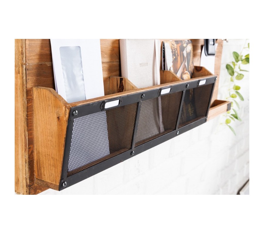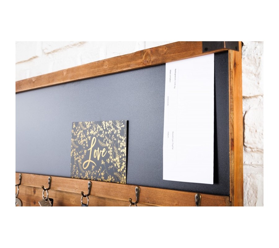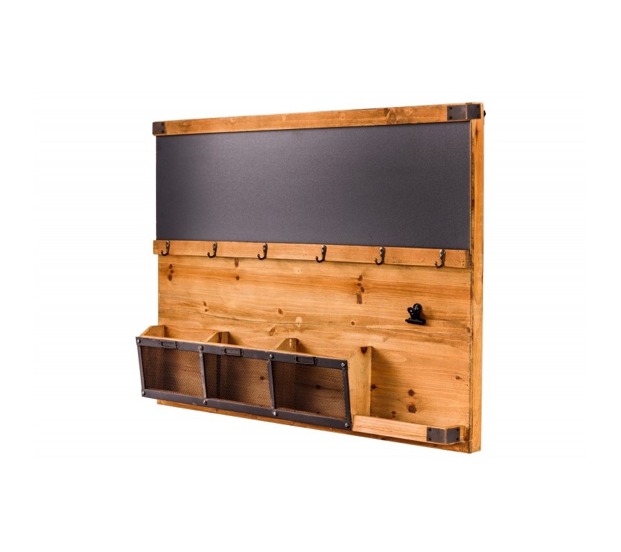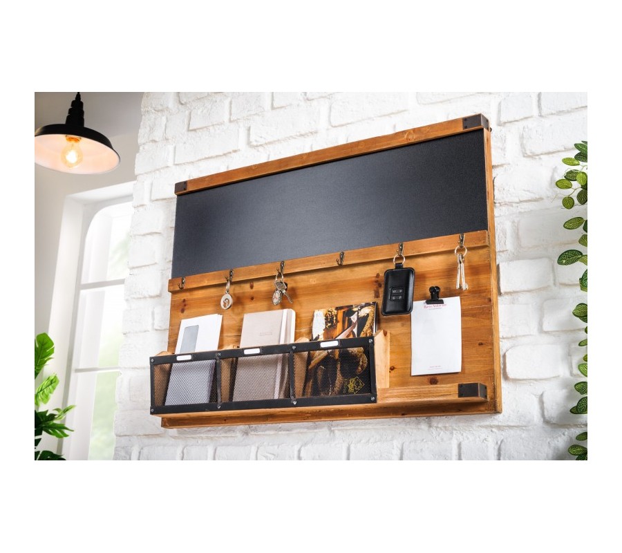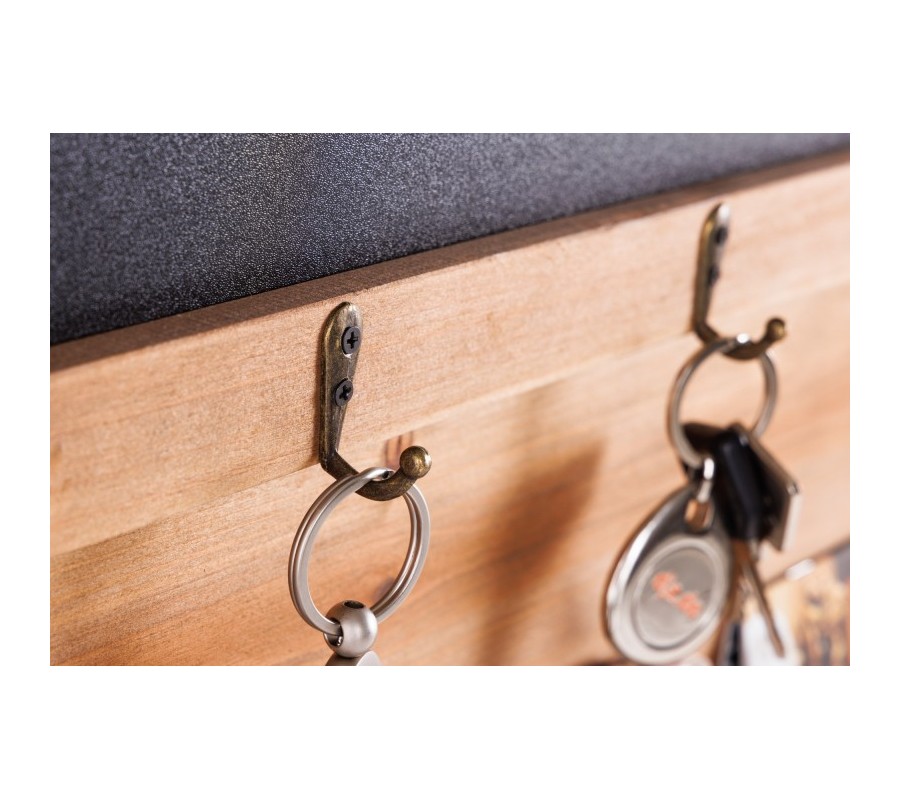 Praktická závesná zostava Woodcut predstavuje tri v jednom: magnetickú tabuľu, šesť vešiakov a organizér s poličkou. Je tak skvelým kúskom vhodným na umiestnenie do predsiení či chodbových priestorov, kde nájde praktické využitie a zároveň efektívne vyplní priestor. Zostava je vyrobená z kvalitného masívneho dreva v svetlohnedom odtieni, ktorý k vám domov vnesie príjemný naturálny nádych. Zaujme tiež viditeľnou kresbou dreva umocňujúcou prírodný vzhľad. Kontrastne k drevu pôsobia čierne kovové prvky- konštrukcia organizéra a praktická tabuľa. Vzniká tak nezameniteľný industriálny efekt, ktorý štýlovo doplní moderné aj alternatívne ladené miestnosti. Organizér vám skvelo poslúži na zavesenie kľúčov, odloženie drobností, ktoré chcete mať vždy po ruke, či pripnutie rôznych odkazov, pohladníc alebo dôležitých dokumentov. Takýmto spôsobom ich budete mať na očiach vždy, keď budete odchádzať, a na vaše povinnosti tak nezabudnete!