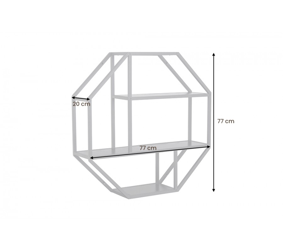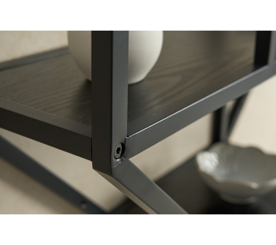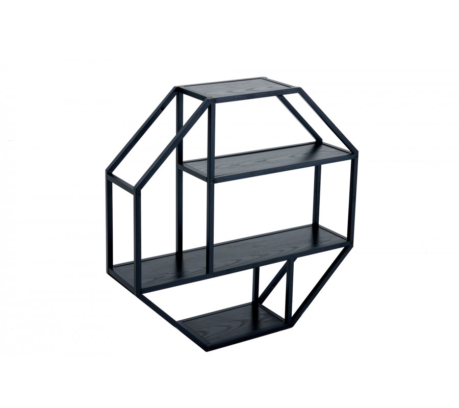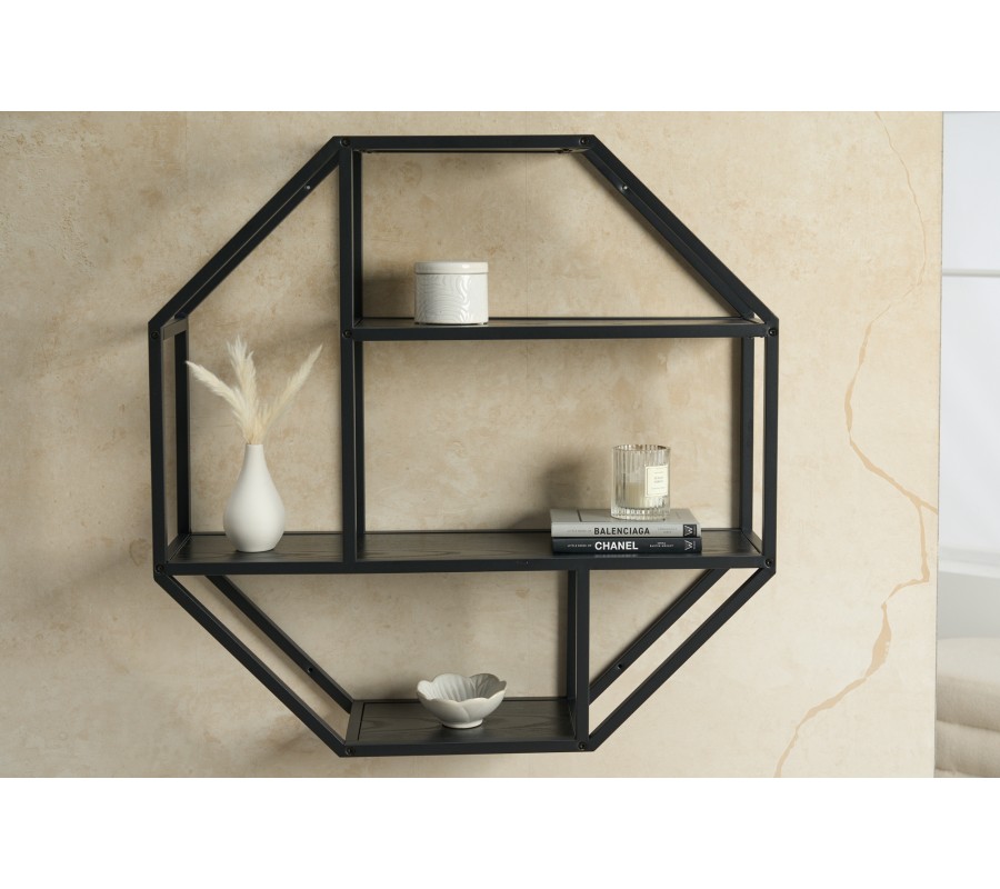 Jedinečná nástenná polička z našej kolekcie nábytku Industria Negra zaujme svojím sofistkovaným dizajnom v industriálnom štýle, ktorý vkusne doplní moderné i alternatívne ladené priestory. Závesný poličkový regál sa pýši kovovou konštrukciou v čiernej farbe s práškovým nástrekom, čo vytvára chladný industriálny vzhľad. Konštrukcia atypického osemuholníkového tvaru disponuje tromi poličkami z masívneho dreva v čiernej farbe, ktoré výborne poslúžia na vystavenie vašich dekorácií, kníh či izbových rastlín. Nástenný regál Industria Negra tak dokonale spája estetickú i praktickú funkciu a vhodne doplní priestory obývačiek, pracovní či študentských izieb. Vďaka univerzálnemu čiernemu prevedeniu skvelo doplní monochromaticky i pestrejšie ladené priestory a získava nadčasový minimalistický vzhľad. Odporúčame tento kúsok kombinovať s moderným nábytkom z kolekcií Industria Negra, Industria Natura či Industria Durante, s tmavými čalúnenými sedačkami či kreslami a doplnkami v kontrastných farbách ako je žltá, biela, zelená či oranžová.