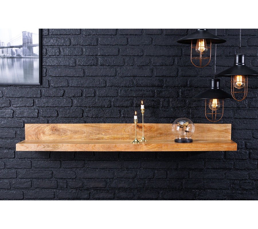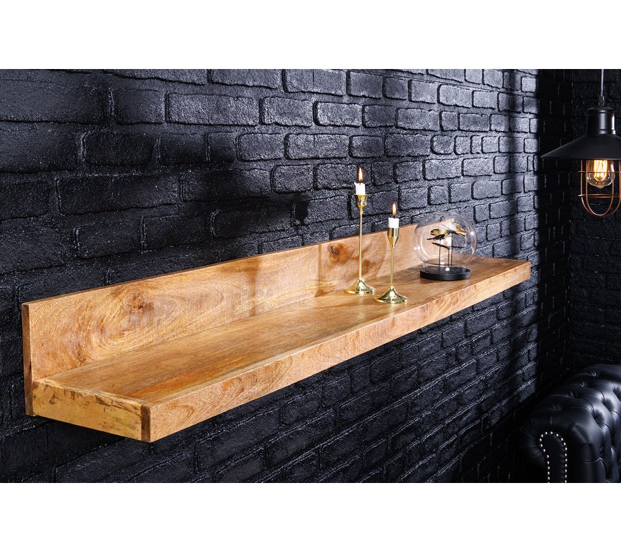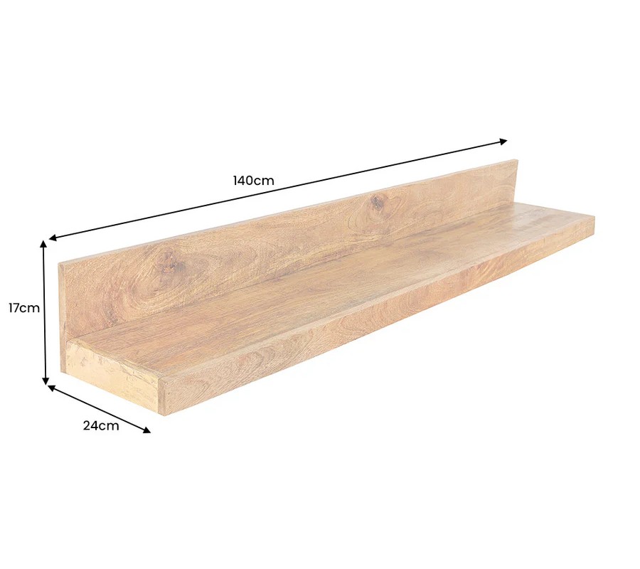 Polica je obdĺžniková, s vyvýšenou zadnou stranou. Je vyrobená z mangového dreva, ktoré jej prepožičiava svoju naturálnu svetlú hnedú farbu s teplými žltými odtieňmi a jemnou kresbou letokruhov. Mangové drevo je obľúbené vďaka svojej vysokej tvrdosti a odolnosti, čo zaručuje nábytku výbornú trvácnosť. S dĺžkou 140 cm a nosnosťou 20 kg vám polica poskytuje bohatý úložný priestor na knihy, dekorácie, či rastliny.
