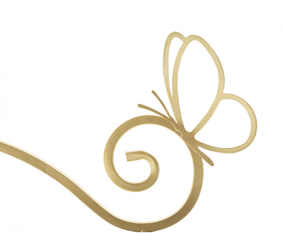 Dekorácia políc je zdôraznená jemnými kovovými ornamentmi, ktoré majú zakrivený tvar pripomínajúci vlnovku alebo špirálu. Na koncoch tejto línie sú umiestnené kovové motýle s otvoreným dizajnom krídel, čím polica získava vzdušný a romantický nádych.