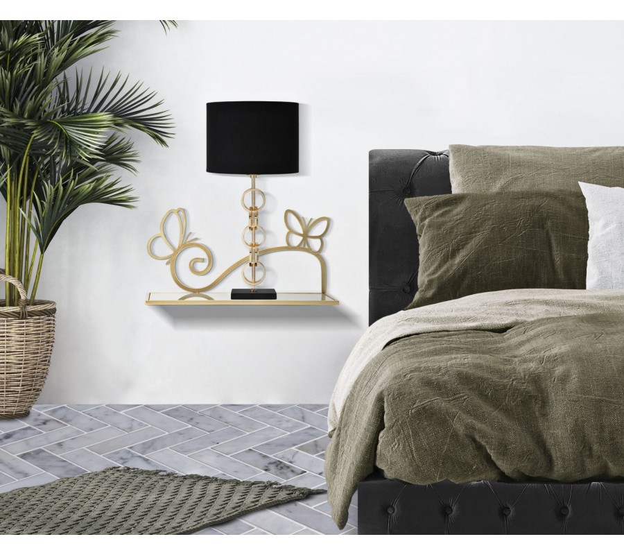 Dizajnová nástenná sada políc Papillon v štýle glamour spája geometrické línie so zdobenými detailmi. Police majú obdĺžnikový tvar a sú vyrobené zo skla, ktoré dodáva dizajnu ľahkosť a sofistikovanosť. Rám je železný, v zlatej farbe, čím vytvára luxusný vzhľad.