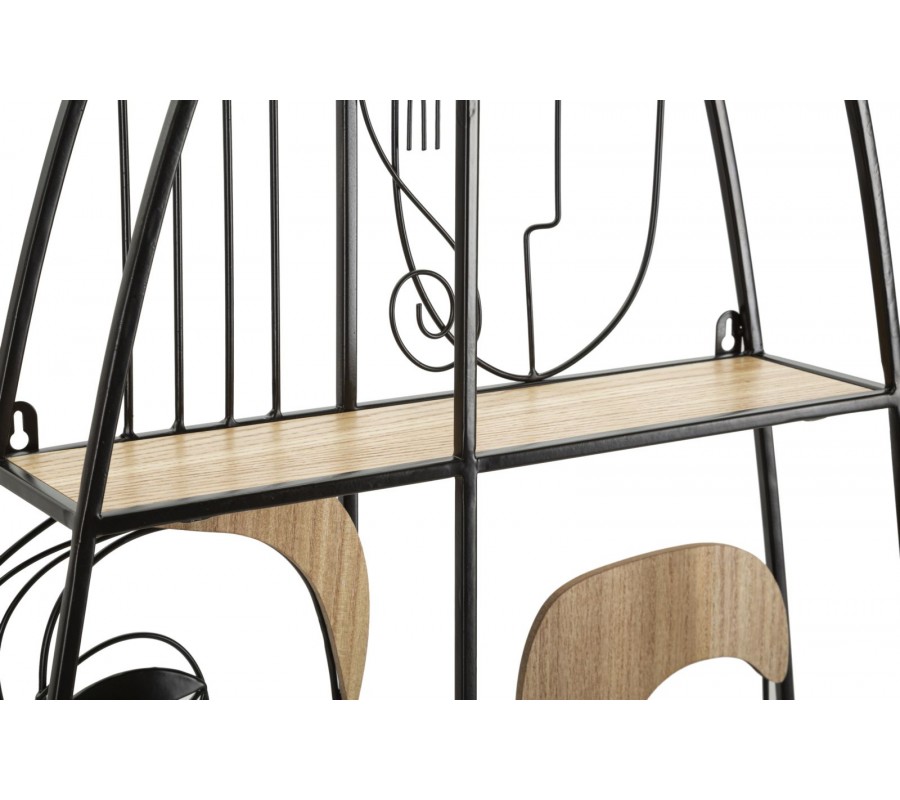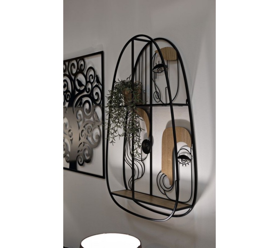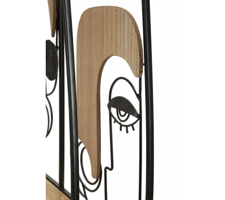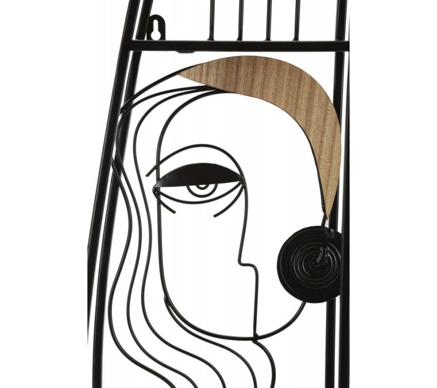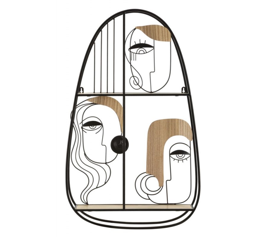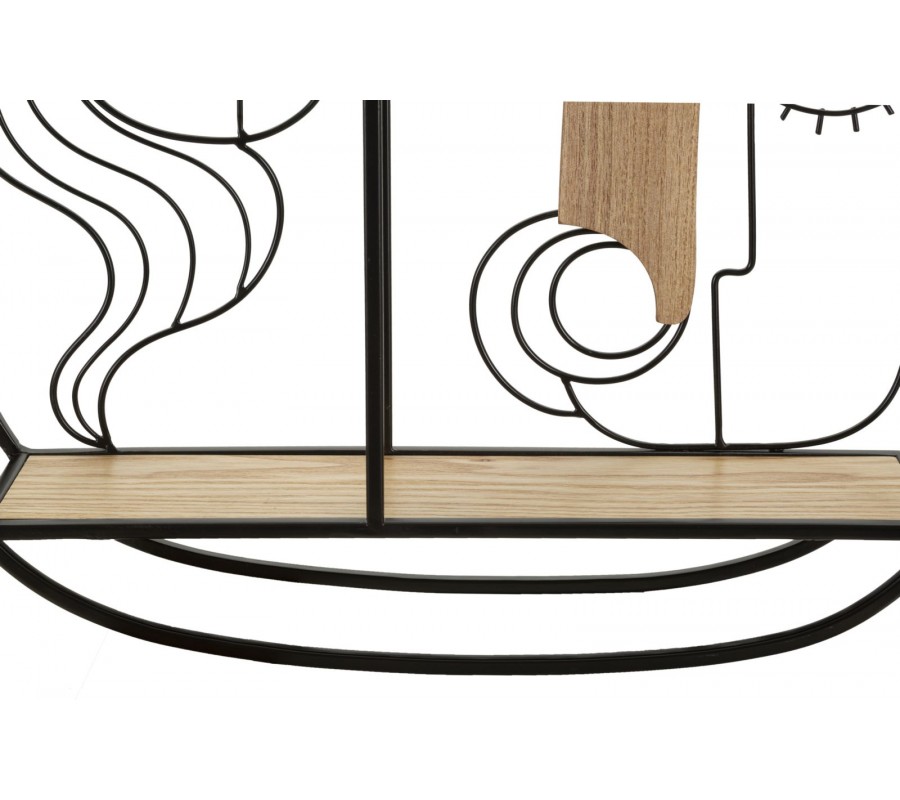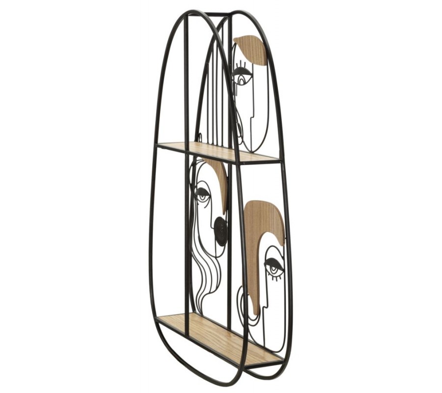 Najvýraznejším prvkom je umelecký reliéf troch ženských tvárí, ktorý evokuje abstraktné moderné umenie. Čierne kovové kontúry tvárí sú doplnené hnedými drevenými detailmi, ktoré zvýrazňujú jednotlivé črty a vytvárajú jedinečný vizuálny efekt. Tento netradičný dizajn v kubistickom štýle robí z police nielen funkčný, ale aj výrazný dekoratívny prvok.