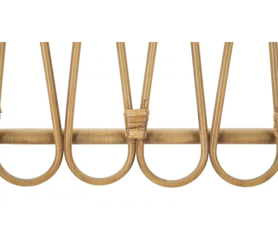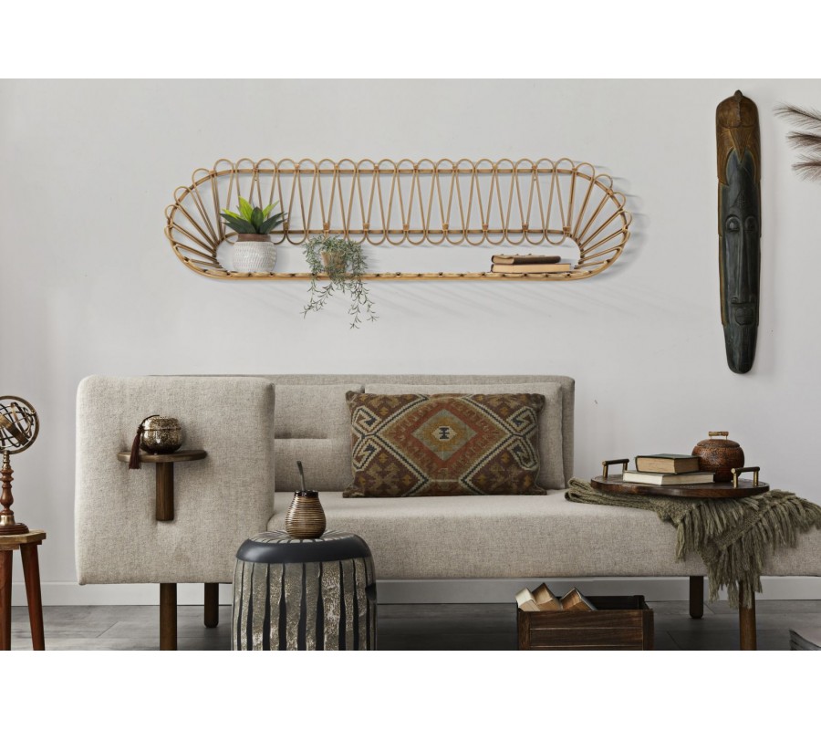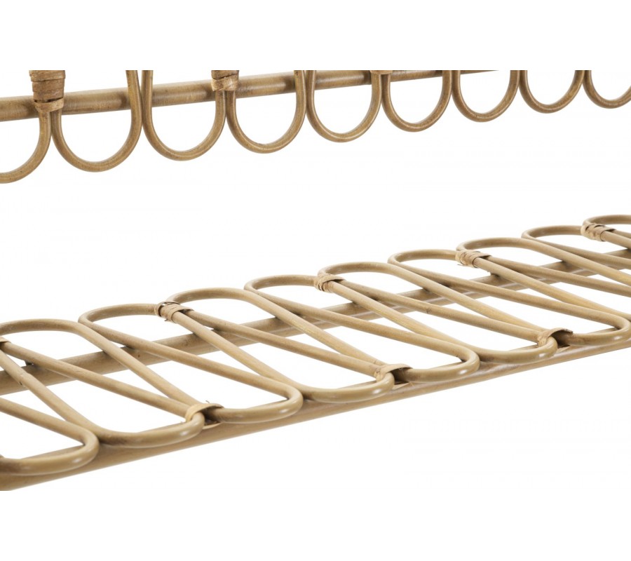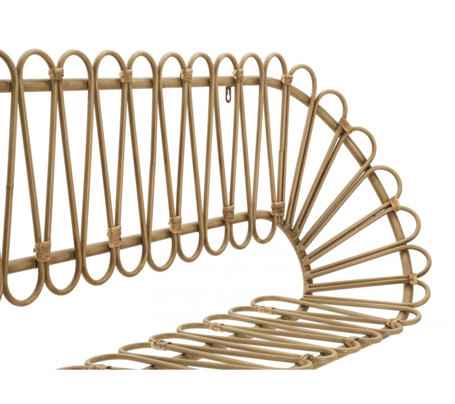 Zaoblené rohy a organický tvar konštrukcie podčiarkujú remeselnú precíznosť, zatiaľ čo dekoratívne pletenie prútov dodávajú nápaditý detail. Rám police sa skladá z dvoch oválov, ktoré poskytujú dostatočný priestor na vystavenie dekorácií, či osobných predmetov. Dekoratívna radiálna kovová konštrukcia je precízne a na pevno spojená uzlovým viazaním z prírodného ratanu, typickým pre ratanový nábytok.