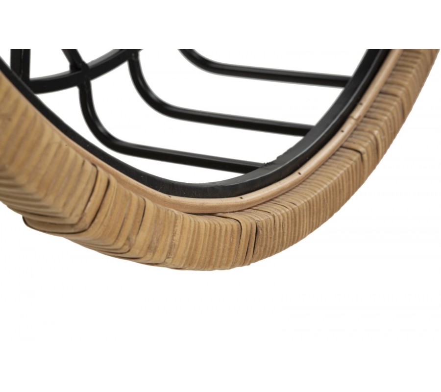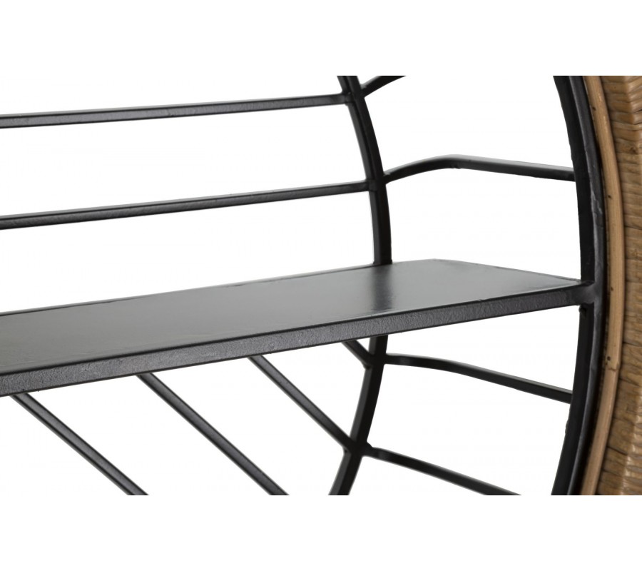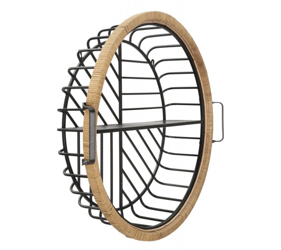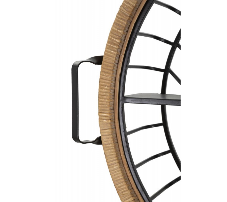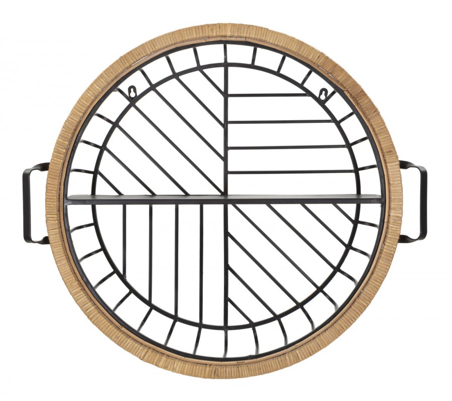 Okrúhla nástenná polica Pavone kombinuje prírodný ratan s čiernym matným kovom, čím vytvára moderný a zároveň prírodný dizajnový prvok. Rám je starostlivo omotaný ratanovým vláknom, zatiaľ čo kovové tyče vo vnútri sú usporiadané do geometrického vzoru rozdeleného na štyri časti, pričom každá sekcia má iný sklon línií. Po stranách sa nachádzajú úchytky ako dizajnový prvok, pričom konštrukcia je prispôsobená na upevnenie na stenu.