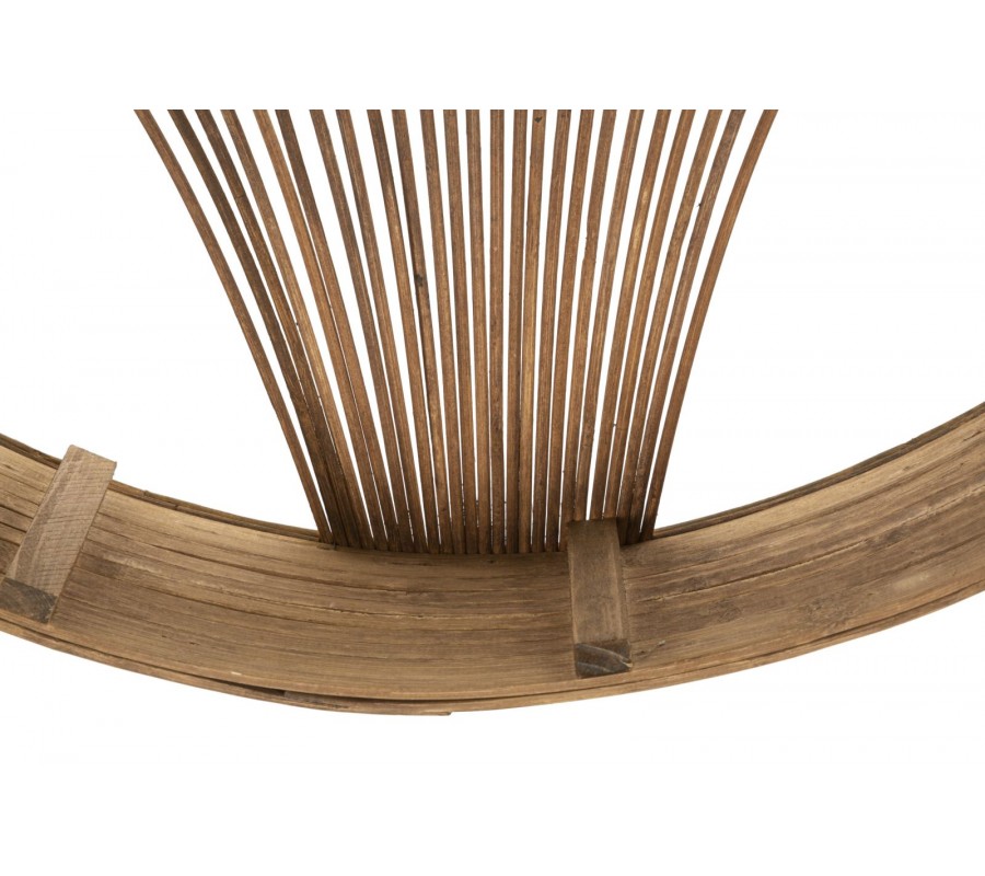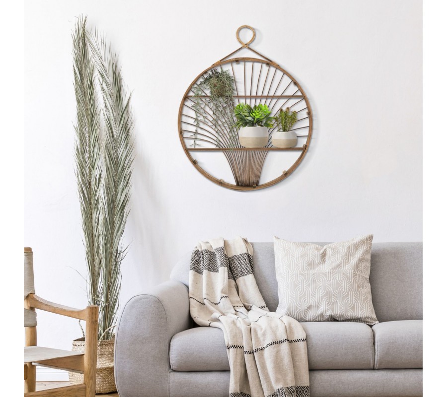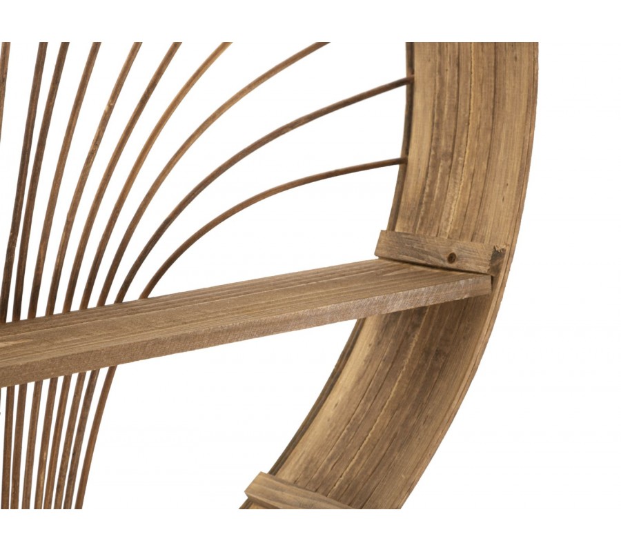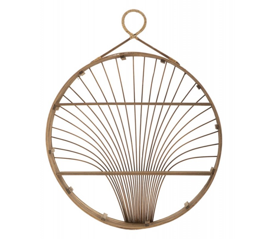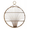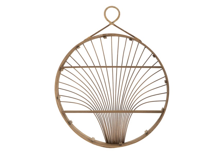 Etno okrúhla nástenná polica Lania z hnedého ratanu s vejárovým vzorom v zadnej časti s dvoma policami so závesným úchytom 76 cm