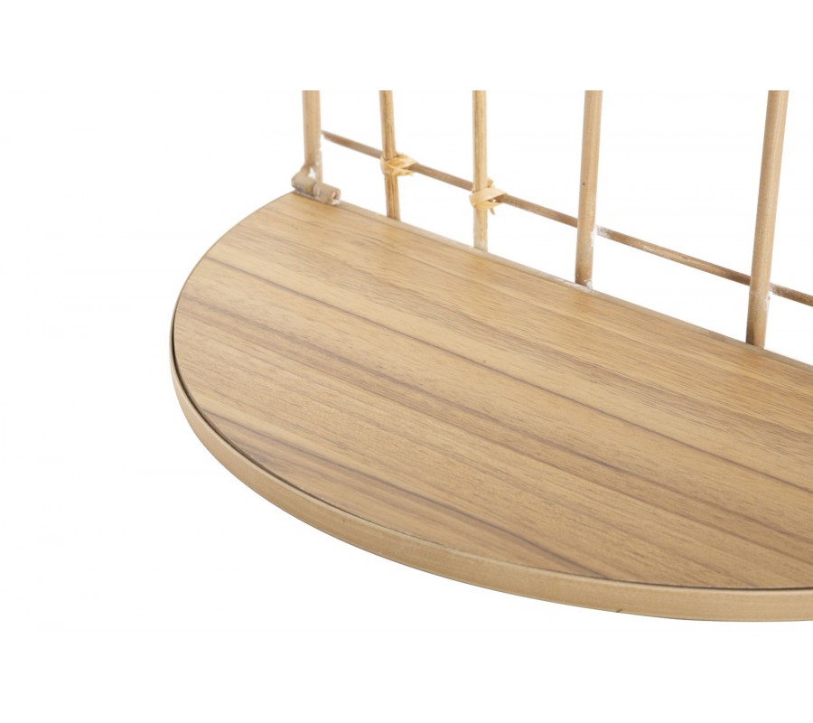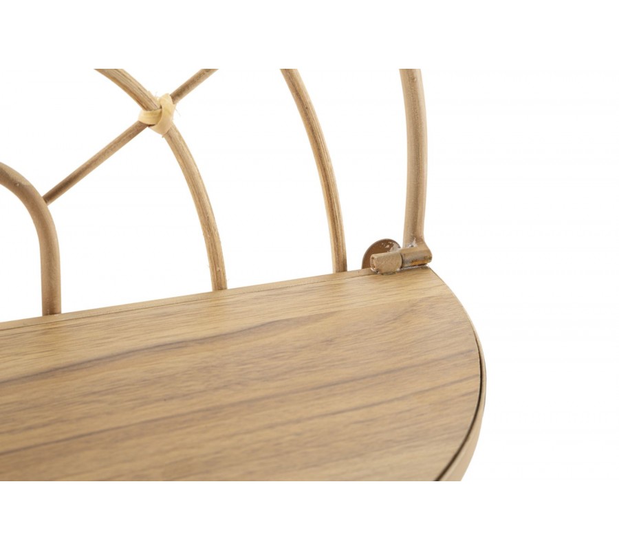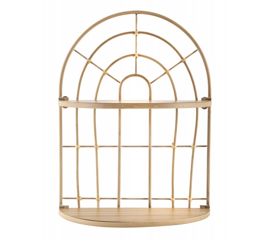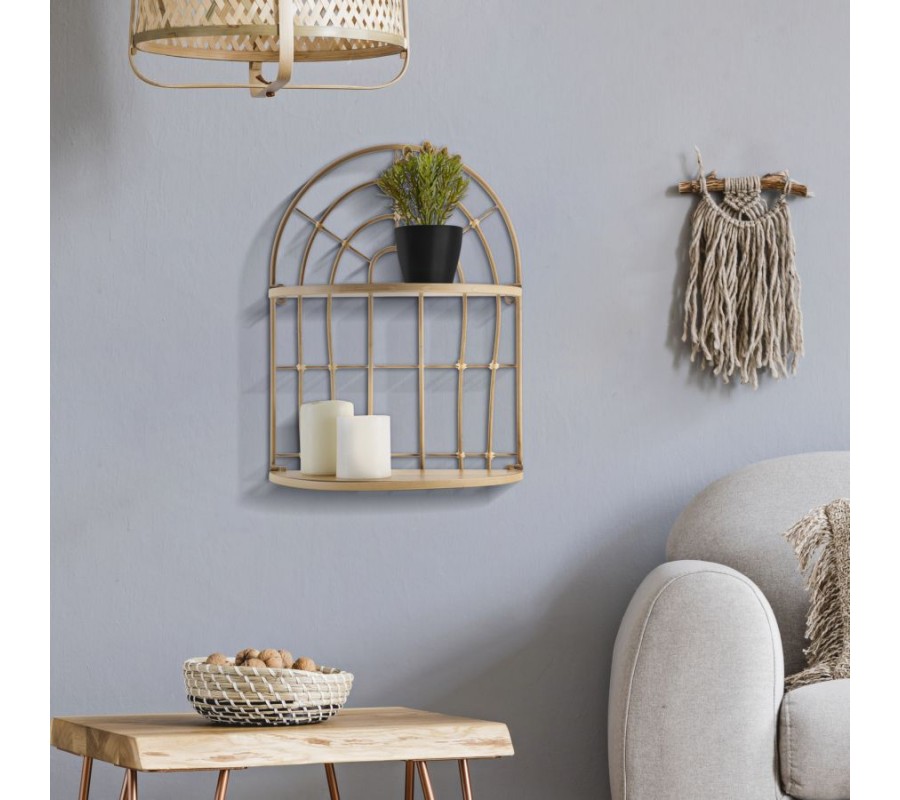 Oblúková nástenná polica Lania v etno štýle kombinuje hnedý ratan s kovovou konštrukciou, čím vytvára unikátny a pevný dizajn. Dve poličky ponúkajú priestor na dekorácie, rastliny alebo drobné predmety, pričom celkový vzhľad zostáva elegantný a vzdušný.