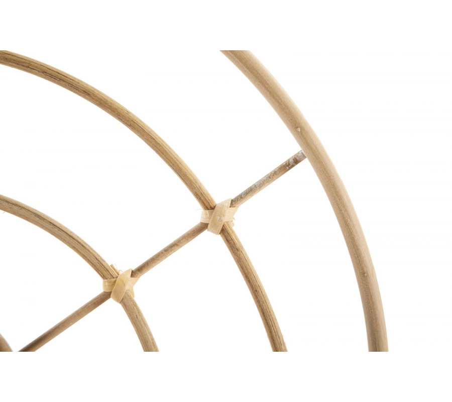 Zadná časť police je zdobená geometrickým vzorom, ktorý pripomína oblúkový ornament, dodávajúc interiéru estetický a štýlový prvok. Pevný kovový rám v hnedej farbe zaisťuje stabilitu a dlhú životnosť, pričom poličky z ratanu pôsobia prírodným dojmom.