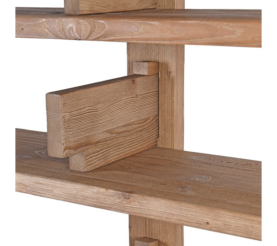 Kompozíciu police tvoria dve vertikálne nosné konštrukcie, ktoré disponujú štyrmi vodorovnými poličkami s výraznými spojmi, ktoré zároveň slúžia ako oporné prvky. Tieto masívne viditeľné spoje z rovnakého dreva, pridávajú dizajnu remeselný charakter a vizuálne dotvárajú policu ako celok, okrem toho zabezpečujú maximálnu stabilitu a pevnosť pri používaní. Jednotlivé poličky sú dostatočne hlboké a priestranné, vhodné na uloženie kníh, dekorácií aj osobných predmetov.