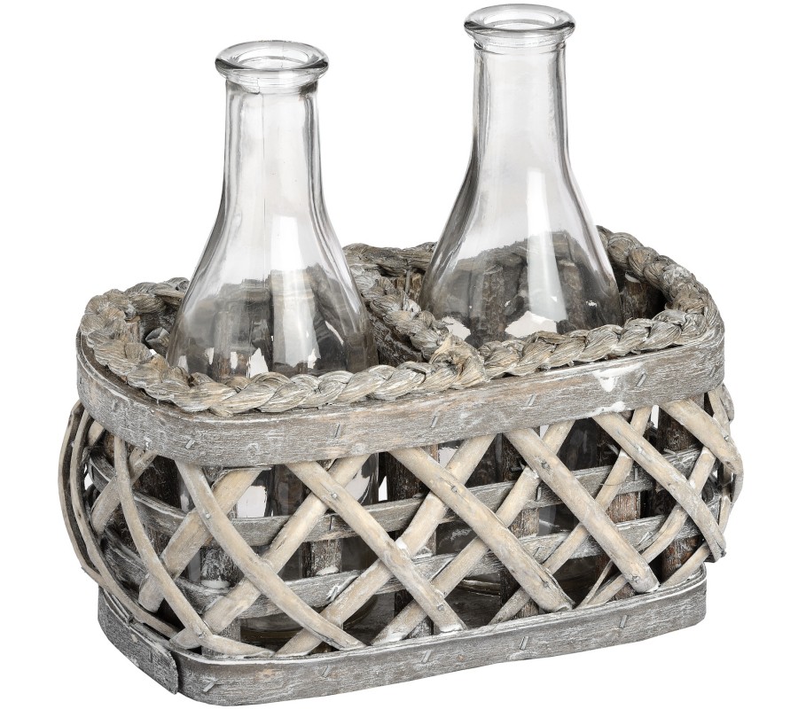 Dizajnový šedý košík z vŕby s dvomi fľašami