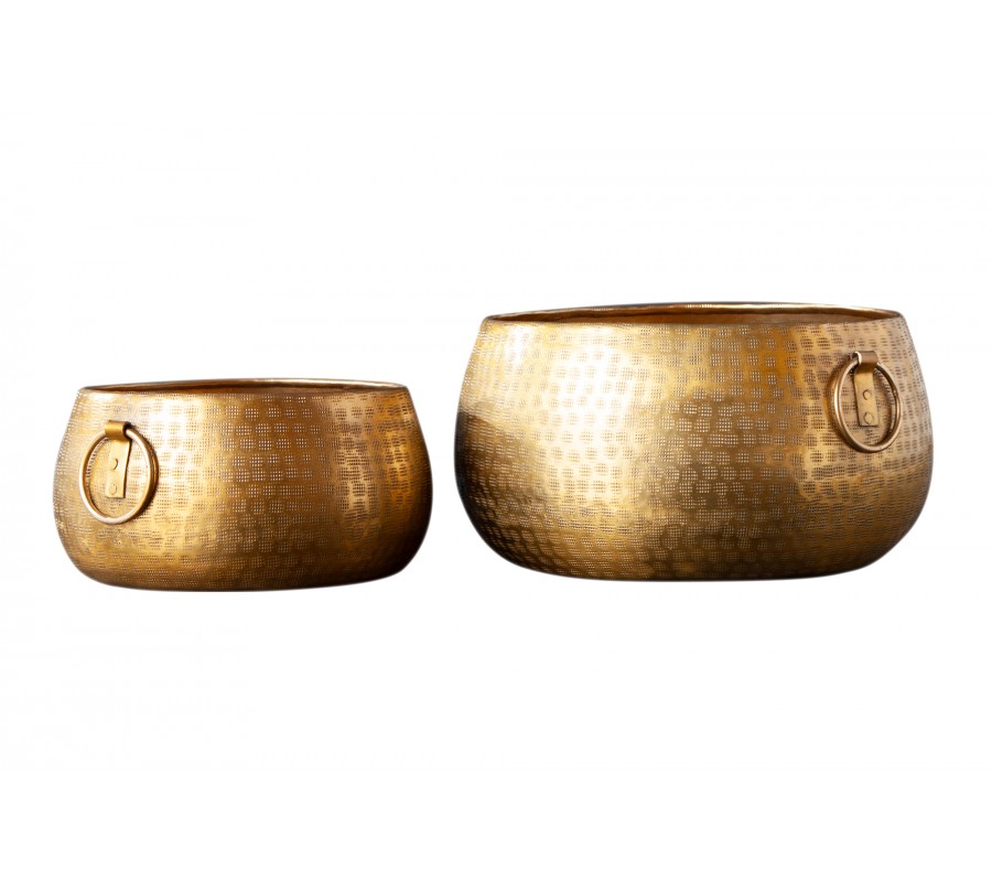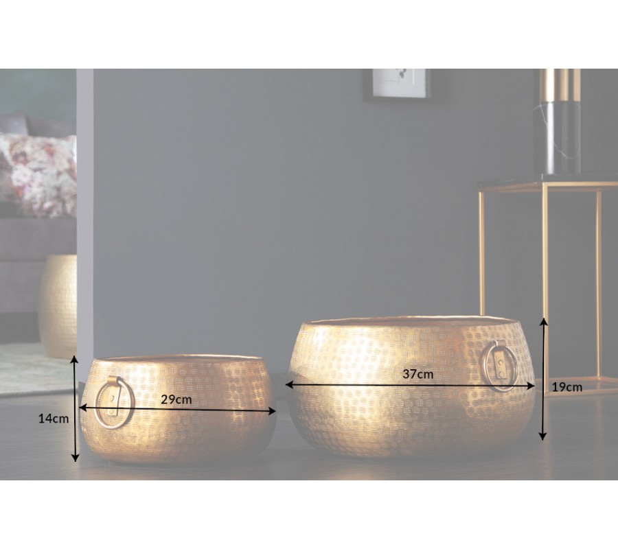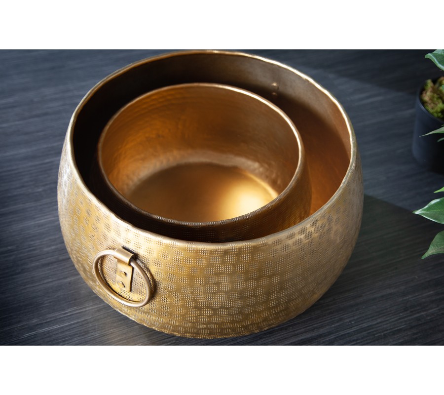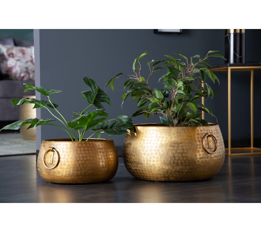 Orientálny dizajnový set nízkych zlatých kvetináčov Cobre zo zliatiny kovu s okrúhlymi rukoväťami 37m