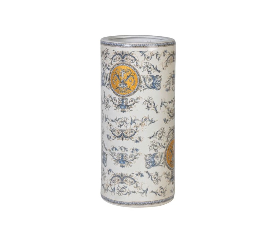 Porcelánový stojan na dáždniky Renes má valcový tvar a hladký, lesklý povrch, ktorý je bohato zdobený ornamentálnymi motívmi v modrej a zlatej farbe. Na povrchu sú znázornené detaily kvetinových vzorov, dekoratívnych medailónov a cherubínov, ktoré mu dodávajú umelecký a luxusný charakter. Dominantné zlaté medailóny s jemnou ornamentikou a cherubínmi vytvárajú sofistikovaný kontrast s krémovým podkladom a modrými dekoráciami.