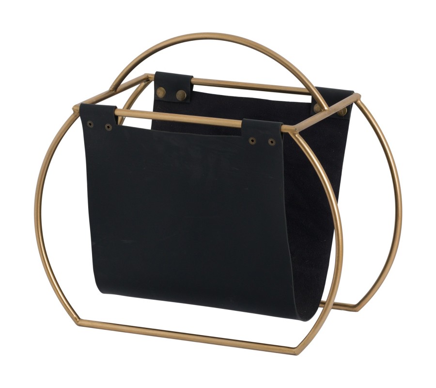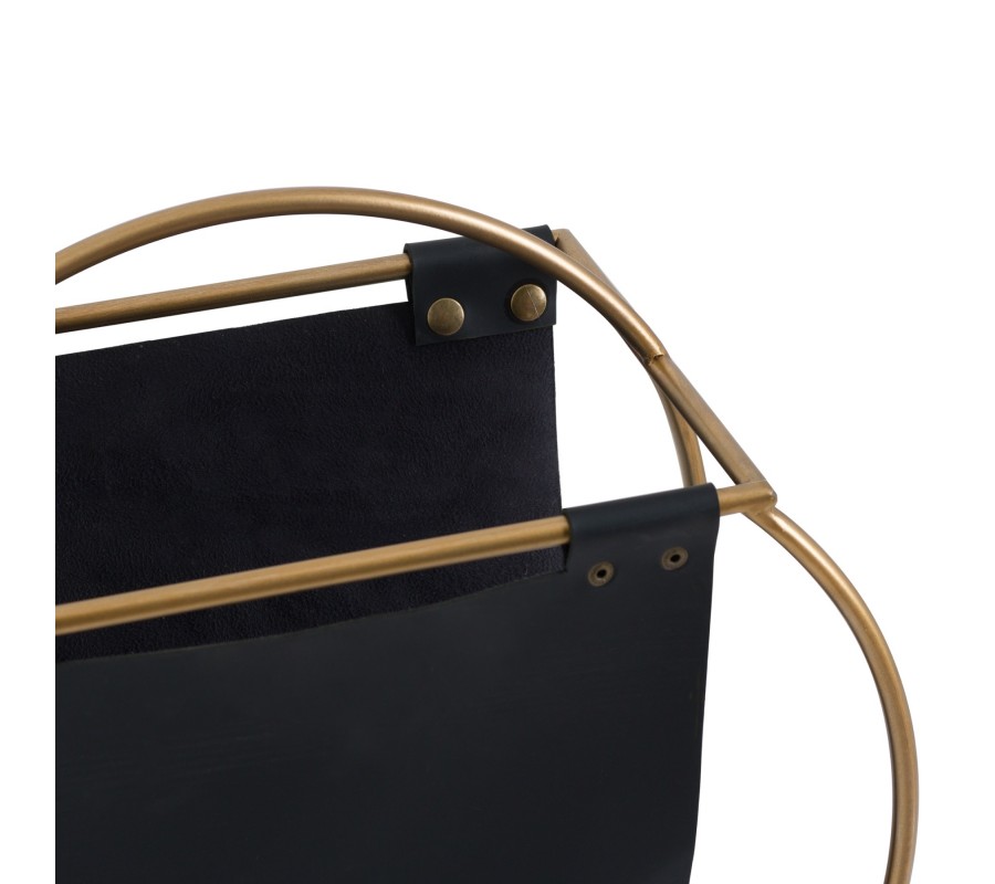 Štýlový stojan na časopisy s prvkami retro štýlu svojim vzhľadom dodá šmrnc každému interiéru. Atypická kovová konštrukcia v anticej zlatej farbe je doplnená čiernym textilným priečinkom.