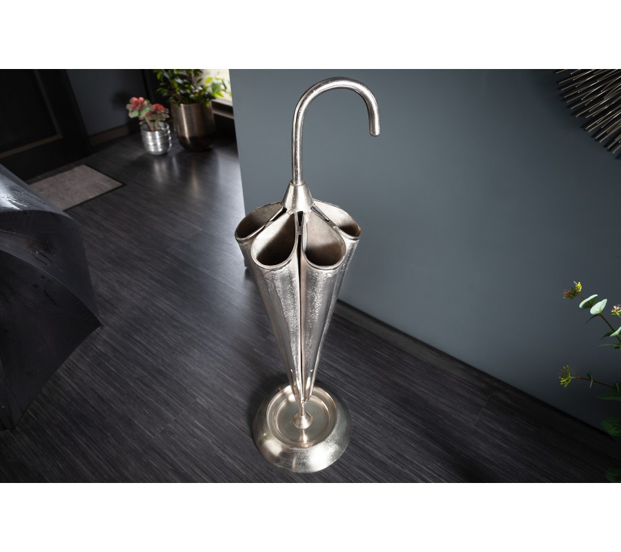 Art-deco dizajnový kovový stojan na dáždniky Rociada striebornej farby v tvare dáždnika 91cm