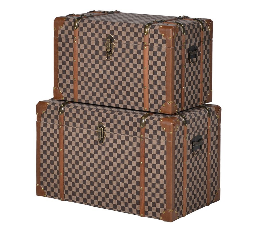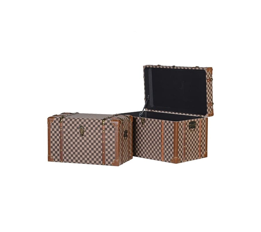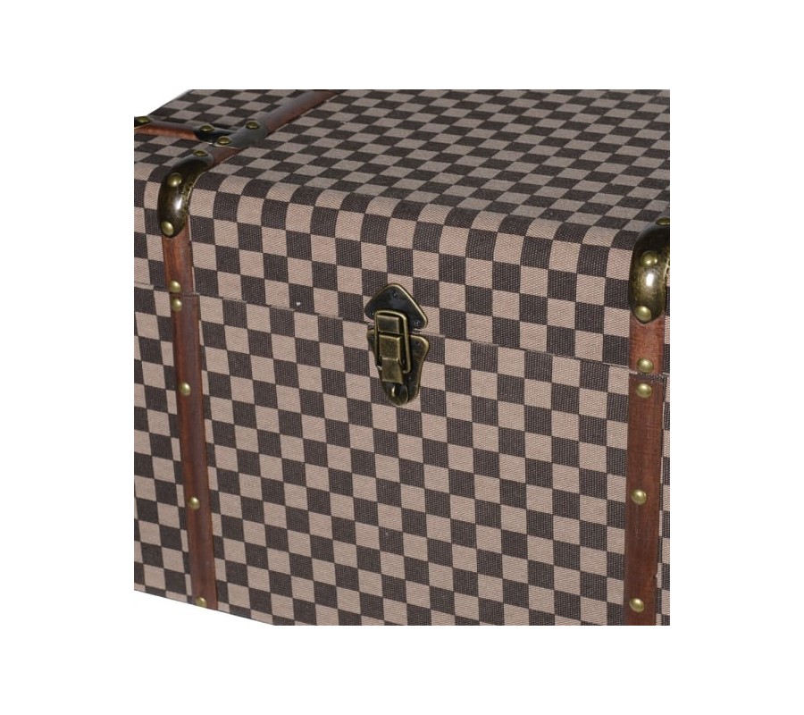 Retro štýlový set dvoch truhlíc Vagner s károvaným čalúnením v hnedých odtieňoch a s dizajnovým kovovým zdobením