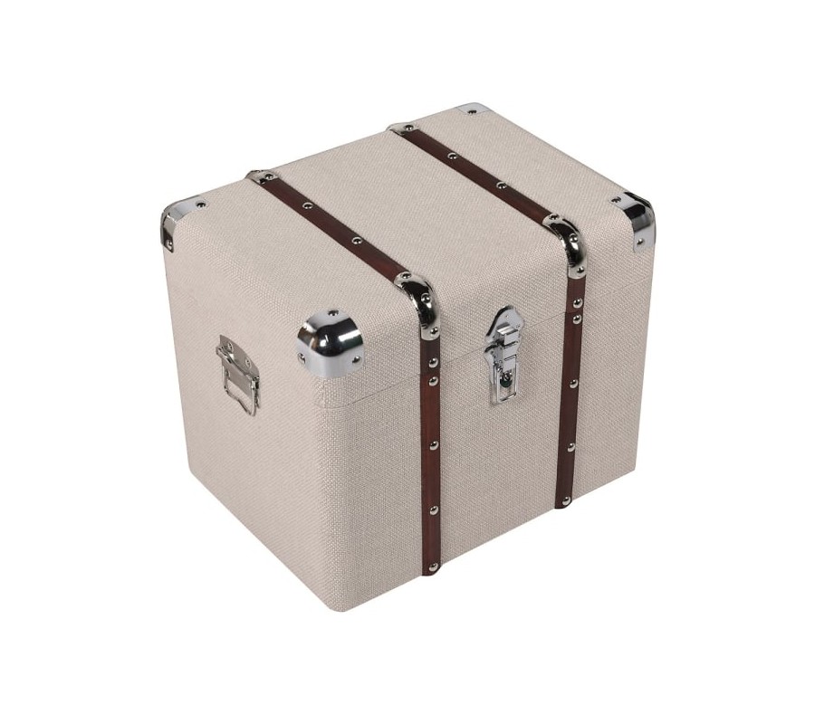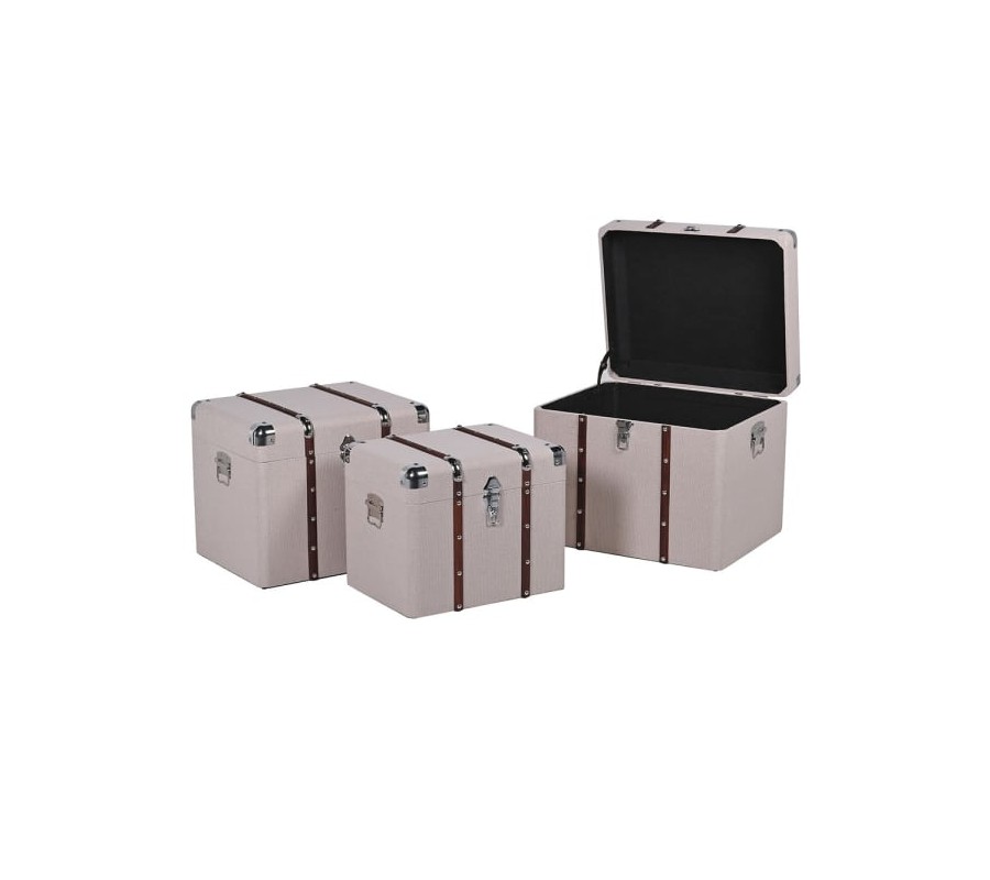 Štýlový set troch truhlíc Kirk je dizajnovým kúskom vhodným predovšetkým do vintage ladených interiérov. Truhlice vyrobené z dreva zaujmú svojím špecifickým dizajnom pripomínajúcim staré cestovné kufre, ktorý je tvorený textilným poťahom v svetlom béžovom odtieni. Vnútro truhlíc je potiahnuté elegantnou čiernou látkou, čo vytvára luxusný vzhľad. Autentický vintage nádych dotvárajú štýlové kovové prvky na rohoch, hnedé vybíjané remene a ozdobné kovové pracky. Truhlice Kirk možno využiť na skladovanie diek, časopisov, kníh či rôznych iných predmetov. Doplnia priestory vašej obývačky, pracovne či spálne, záleží len na vás, ako sa rozhodnete tento štýlový set využiť. Doplnením do miestnosti zariadenej nábytkom z masívneho dreva s čalúnenými prvkami dosiahnete nezameniteľný vintage efekt!