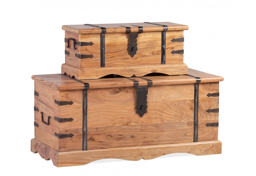 Sú vyrobené z masívneho akáciového dreva v nádhernej prírodnej medovej hnedej farbe s viditeľnou kresbou letokruhov. Na truhliciach sa nachádza ozdobné kovové kovanie, zatvárací mechanizmus a dvojica úchytiek na bočných stranách v čiernej farbe.