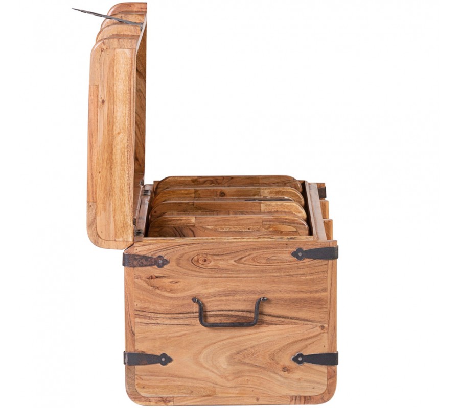Sadu tvoria dve truhlice, väčšia s rozmermi 72x36x36 cm a menšia s rozmermi 52x27x27 cm. Menšiu truhlicu je v prípade potreby možné uložiť do väčšej. Sú vyrobené z akáciového dreva v prírodnom medovom hnedom odtieni. Exotický pôvod tohto materiálu ešte zdôrazňuje koloniálny štýl. Truhlice dopĺňajú kovové detaily v tmavej farbe.
