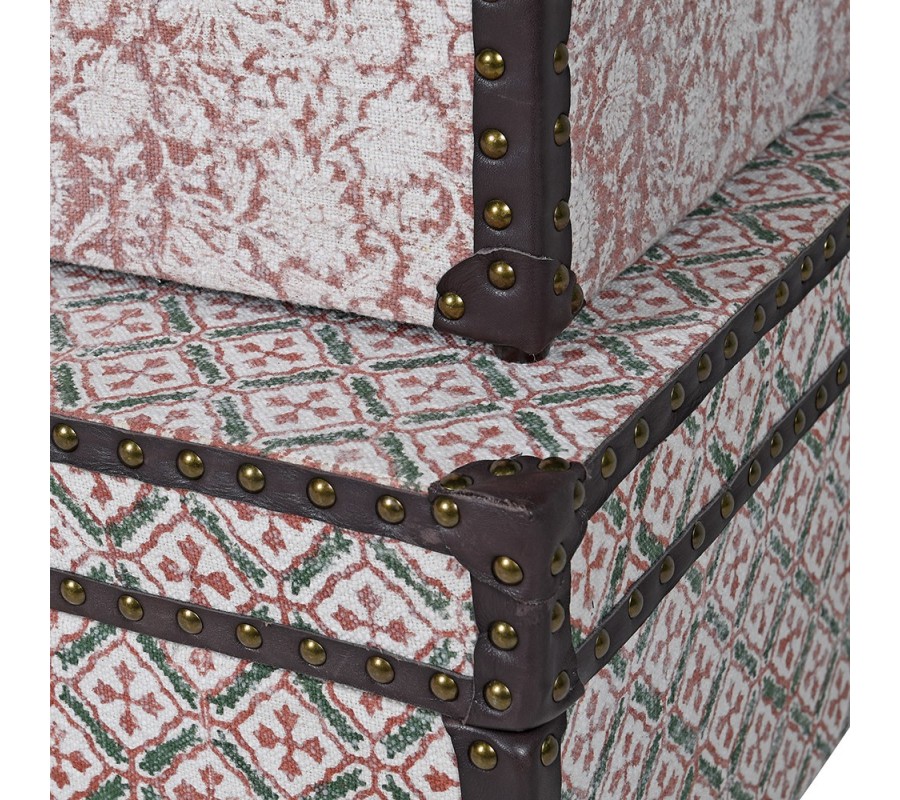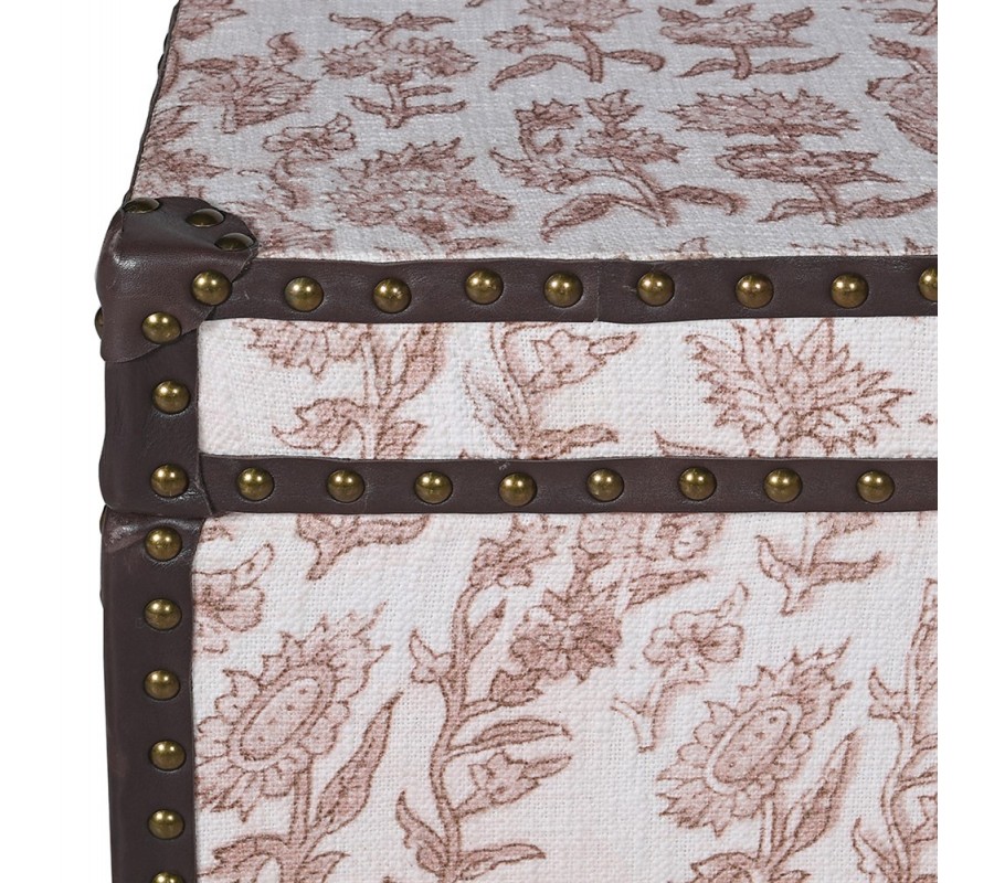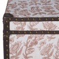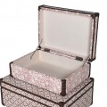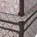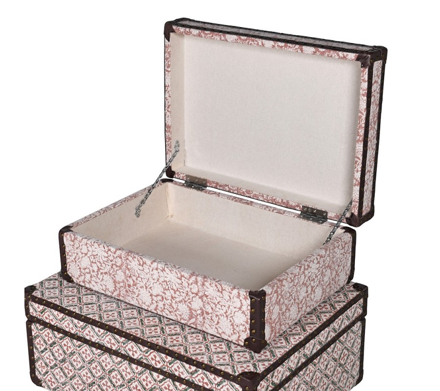 Najväčšia truhlica je potiahnutá látkou s jemným kvetinovým motívom pripomínajúcim listy a vetvičky v staroružovo-hnedastých odtieňoch. Stredná truhlica má detailný rastlinný vzor v sýtejšom červeno-béžovom tóne. Najmenšia truhlica zaujme geometrickým dizajnom so štvorcovou kompozíciou v ružovo-zeleno-krémovej farebnosti, ktorý pôsobí sviežo a zároveň tradične. Každý kus je orámovaný hnedým koženým lemovaním s rohovými výstuhami a dekoratívnym nitovaním v zlatej farbe, čo odkazuje na staré cestovné kufre a zároveň zabezpečuje pevnosť a stabilitu.