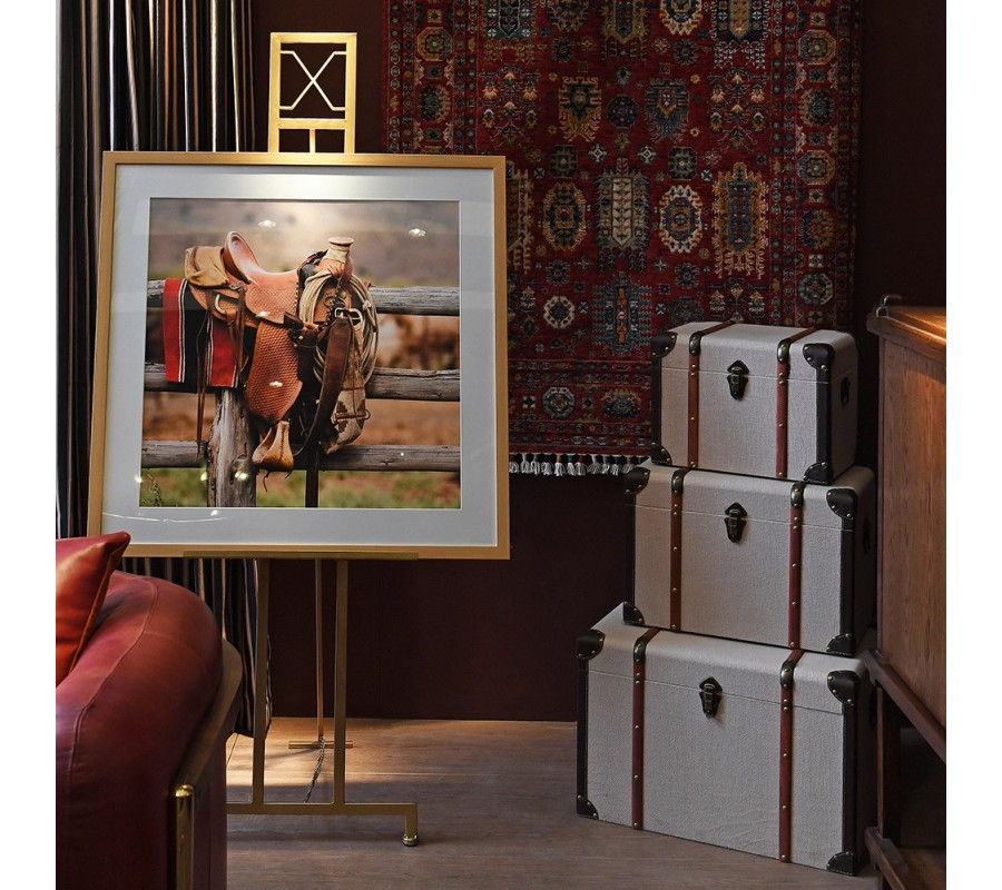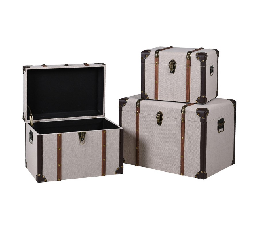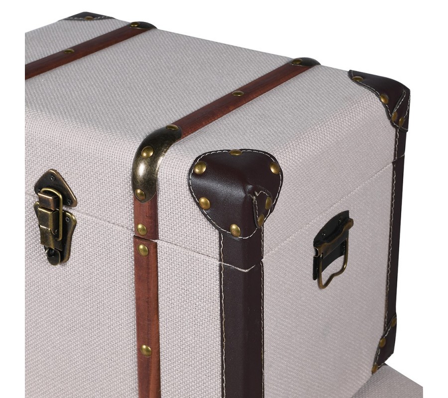 Vintage set kufrov Voyage prináša do interiéru eleganciu minulých čias spojenú s praktickým využitím. Kufre sú vyrobené z drevenej konštrukcie potiahnutej béžovou látkou, ktorá pôsobí prirodzene a jemne. Ich dizajn je zvýraznený hnedými drevenými detailmi v podobe vertikálnych a horizontálnych pásov a kovovými rohmi, ktoré nielen dekorujú, ale aj chránia kufre pred poškodením.