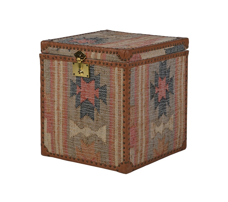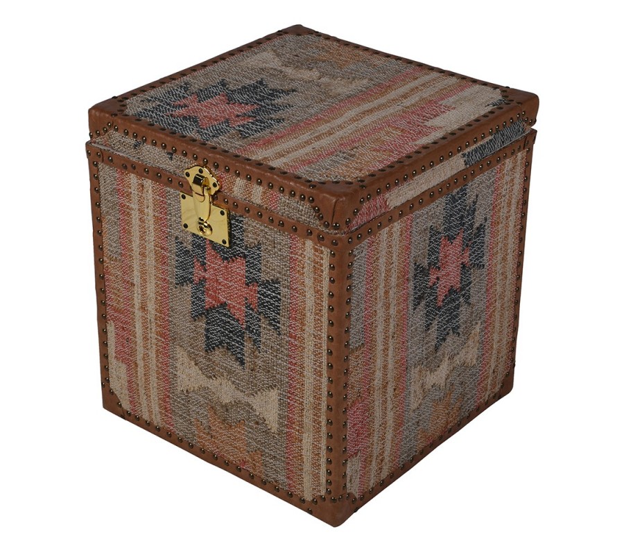 Etno orientálna štvorcová truhlica Amina s poťahom z juty a bavlny s kilim vzorom v hnedých odtieňoch 63 cm