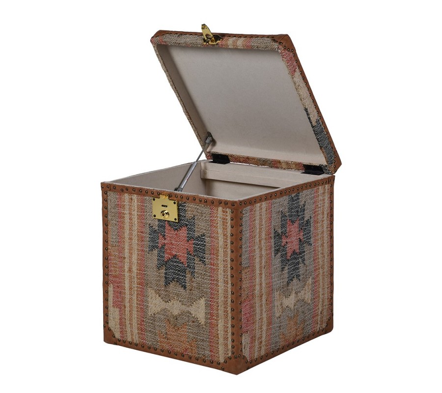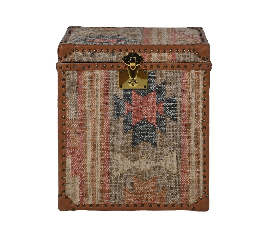 Štvorcová truhlica Amina je výrazný dekoratívny a zároveň praktický doplnok inšpirovaný orientálnym a etno štýlom. Jej povrch je potiahnutý kombináciou juty a bavlny s tradičným kilim vzorom v zemitých tónoch hnedej, béžovej, tehlovej a tlmenej modrej. Textília pôsobí autenticky a remeselne, s jemnou štruktúrou tkania, ktorá dodáva truhlici prirodzený charakter, hĺbku a pocit tepla. Vzor je výrazný, no harmonický, takže truhlica funguje nielen ako úložný priestor, ale aj ako plnohodnotný dizajnový prvok v interiéri.
