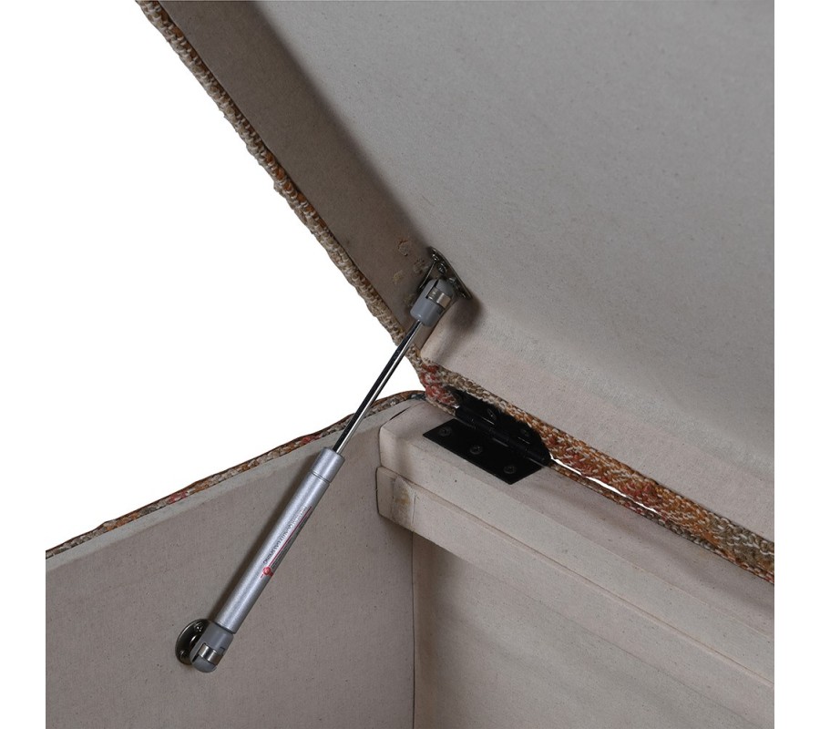 Hrany sú zvýraznené hnedým koženým lemovaním s kovovými nitmi. Tento detail nielen zvyšuje odolnosť namáhaných častí, ale zároveň dodáva truhlici kvalitný, remeselný vzhľad a vizuálne ju rámuje. Kombinácia textilu, kože a kovu pôsobí vyvážene a hodnotne, vďaka čomu truhlica Amina vynikne aj ako samostatne stojaci solitér.