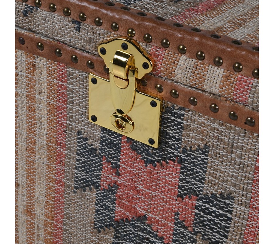 Konštrukcia truhlice je pevná a stabilná. Vnútro nie je drevené, ale taktiež potiahnuté textíliou v neutrálnej sivej farbe, ktorá pôsobí čisto, prakticky a vizuálne neruší uložené predmety. Vrchná časť je vyklápacia a umožňuje pohodlný a široký prístup k úložnému priestoru, vhodnému najmä na väčšie predmety, textílie alebo sezónne doplnky. Prednú stranu dopĺňa kovový zámok v zlatej farbe, ktorý truhlici dodáva jemný dekoratívny akcent s ľahkým nádychom vintage štýlu, bez toho, aby pôsobila staromódne.