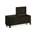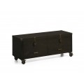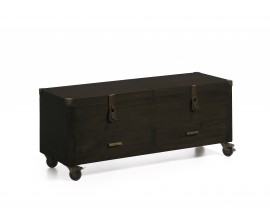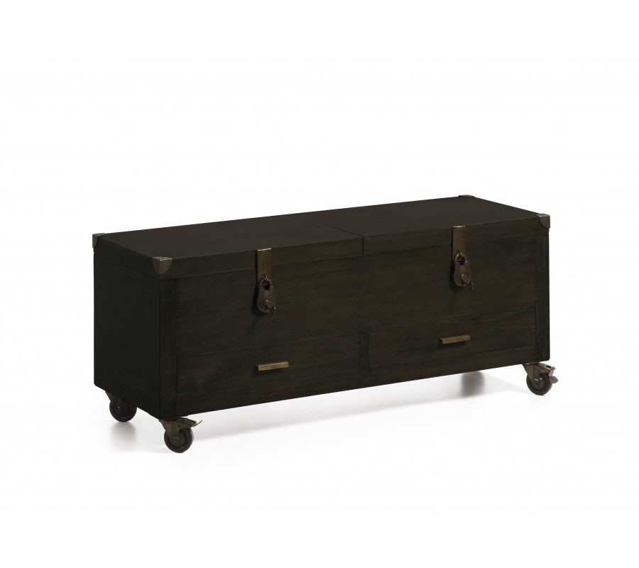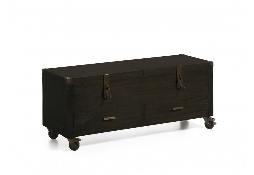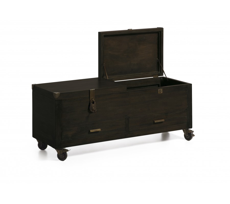 Luxusná štýlová truhlica na kolieskach z kolekcie M-INDUSTRIAL je vyrobená z masívneho koloniálneho dreva MINDI. Kovové prvky na rohoch a kovové rukoväte dodávajú truhlici zaujímavý industriálny nádych. Disponuje praktickými zásuvkami a otvára sa pomocou dvoch vyklápacích dvierok na vrchu, ktoré sú taktiež zamykateľné. Štýlová čierna farba je nadčasová a univerzálna, v kombinácii s kovovými prvkami vytvára zaujímavý súlad. Dá sa taktiež ľahko kombinovať so širokou škálou iných farieb. Ideálne sa hodí do industriálne ladeného interiéru a môžete ju využiť na odkladanie rôznych predmetov. Praktické kolieska vám umožnia ľahkú manipuláciu.