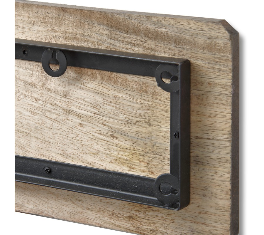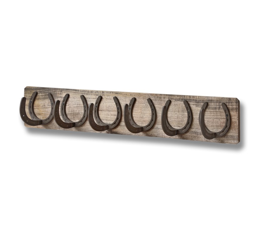 Vešiak so šiestimi háčikmi z kovu imitujúci konskú podkovu na drevenom lopári.