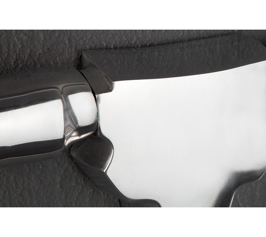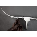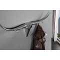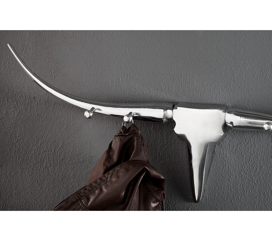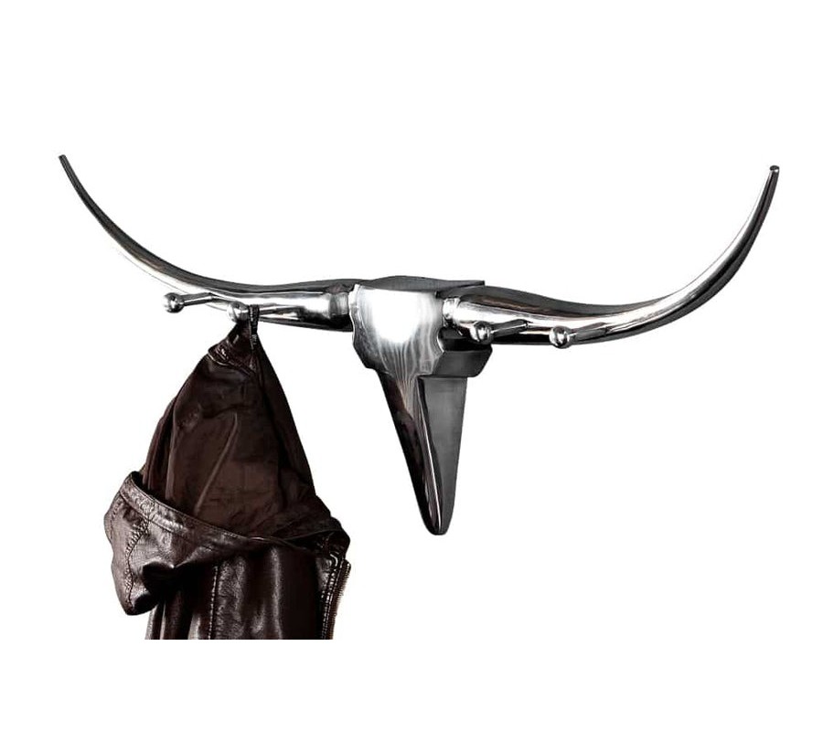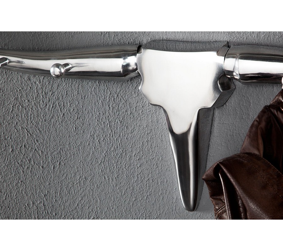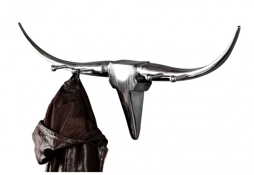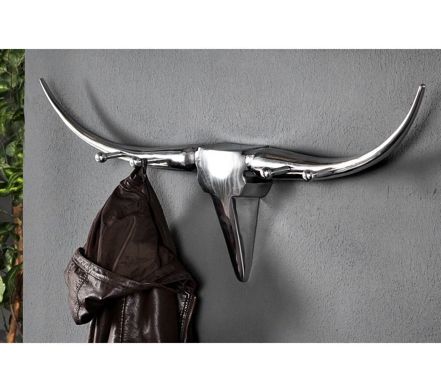 Kovový vešiak Bull zaujme svojím výrazným tvarom býčej lebky s dlhými, elegantne rozprestretými rohmi a lesklým chrómovým povrchom v striebornej farbe. Tento nápaditý kúsok spája glamour štýl s vidieckym motívom a pôsobí ako dizajnový objekt s praktickým využitím.