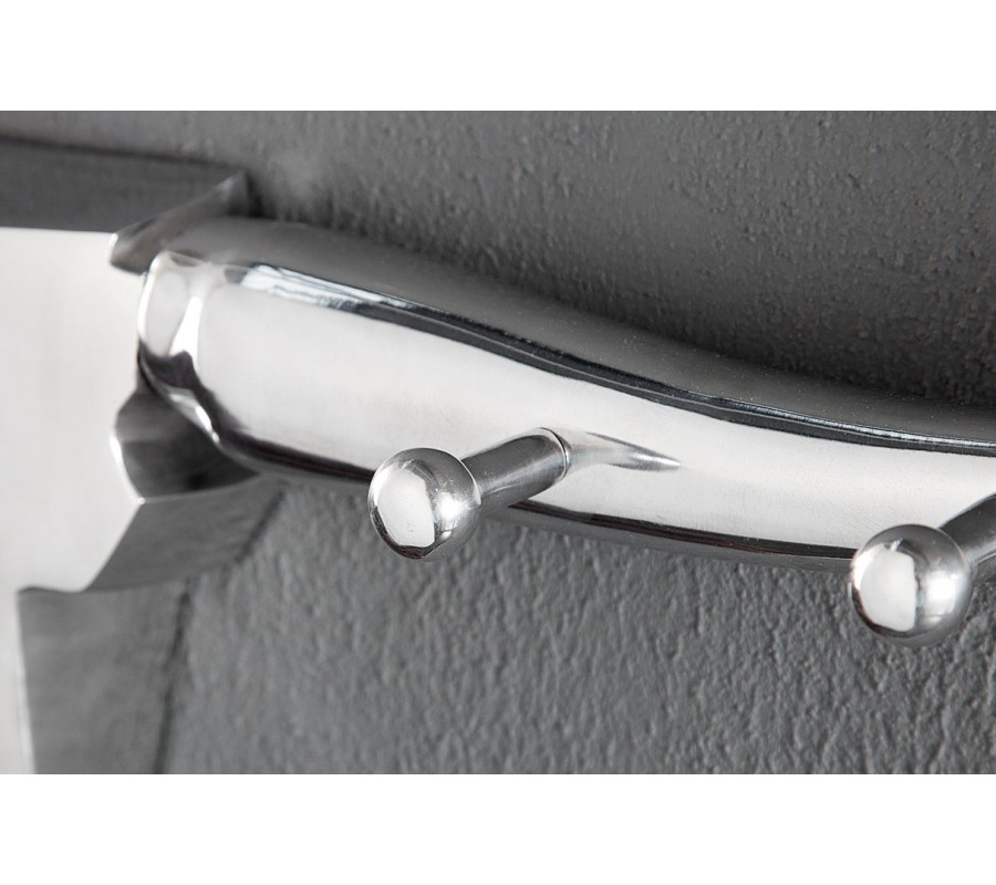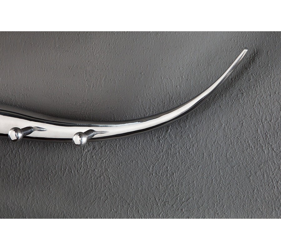 Tento 100 cm široký vešiak je vhodný ako solitér na voľnú stenu, kde môže vyniknúť jeho silueta aj strieborný lesk. Odporúčame ho kombinovať s tmavým drevom, prírodnou kožou alebo striebornými a čiernymi kovovými detailmi.