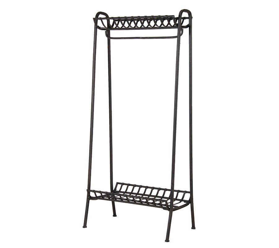 Vintage kovový vešiak Arlen je štýlovým a praktickým prvkom, ktorý spája funkčnosť s originálnym dizajnom. Jeho čierna kovová konštrukcia s jemne prehĺbenou spodnou poličkou s mriežkami ponúka priestor na topánky, boxy či úložné koše. V hornej časti sa nachádza menšia polička s rovnakým mriežkovým vzorom, ktorá dopĺňa hlavnú tyč na zavesenie odevov. Celkovú stabilitu a vizuálnu eleganciu podčiarkujú bočné nohy v tvare písmena A, ktoré pôsobia vzdušne a zároveň pevne. Vešiak je z kombinácie masívneho a dyhovaného dreva.