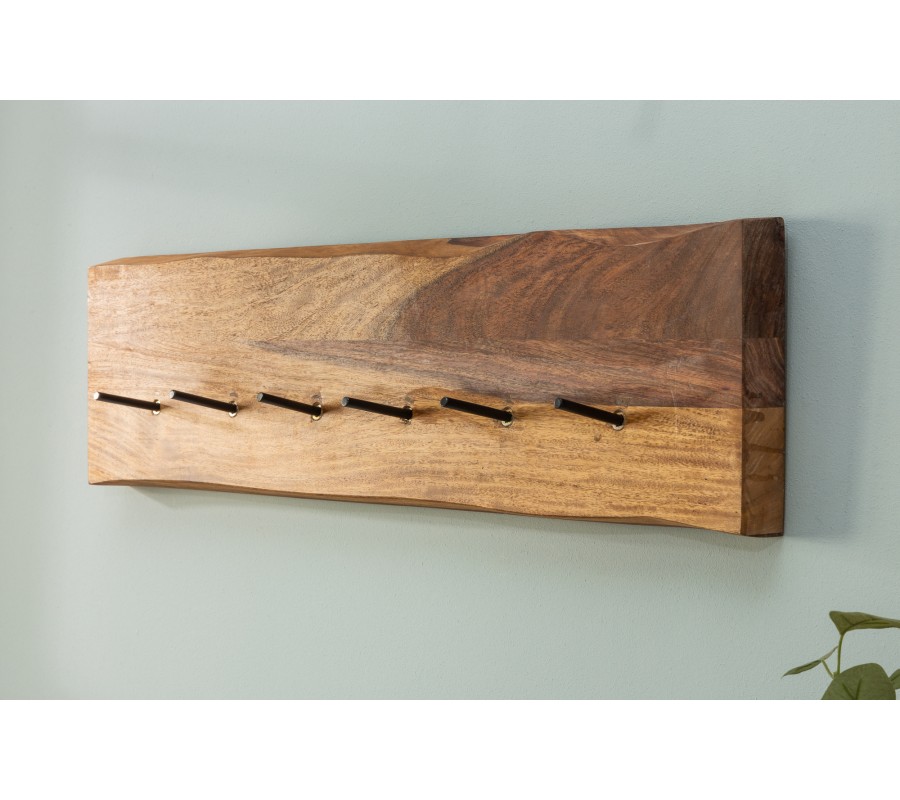Jedinečný a nadčasový industriálny nástenný vešiak z kolekcie Mammut pohodlne uskladní Vaše kabáty a poskytne dostatok priestoru i Vašej návšteve vďaka šiestim kovovým vešiakom. Dizajnový vešiak Mammut je vyhotovený z plátu masívneho dreva sheesham v príjemných naturálnych odteňou s povrchovou úpravou, ktorá dovoľuje vyniknúť prirodzenej kresbe dreva. Nadčasový nástenný vešiak Mammut odporúčame kombinovať najmä s prírodnými materiálmi a nadčasovými dekoráciami a so živou zeleňou v rámci moderných hál či kancelárií a reštaurácií.