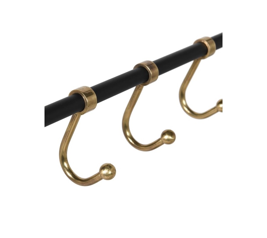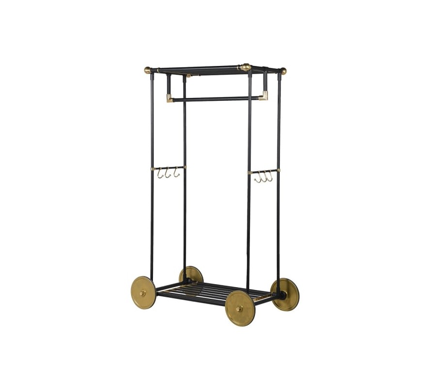 Elegantný vešiak Trolley má jednoduchú a funkčnú konštrukciu s čistými líniami, ktorá kombinuje čiernu farbu s mosadznými detailmi, čo mu dodáva luxusný a retro nádych. Vešiak je vybavený robustnými kolieskami, ktoré zaisťujú jednoduchú mobilitu a flexibilné využitie. Obsahuje hornú tyč na zavesenie odevov na vešiaky, dve bočné sady háčikov na menšie predmety, ako sú tašky alebo šatky, a spodnú mriežkovanú policu, ktorá slúži na uloženie topánok, krabíc alebo iných doplnkov.